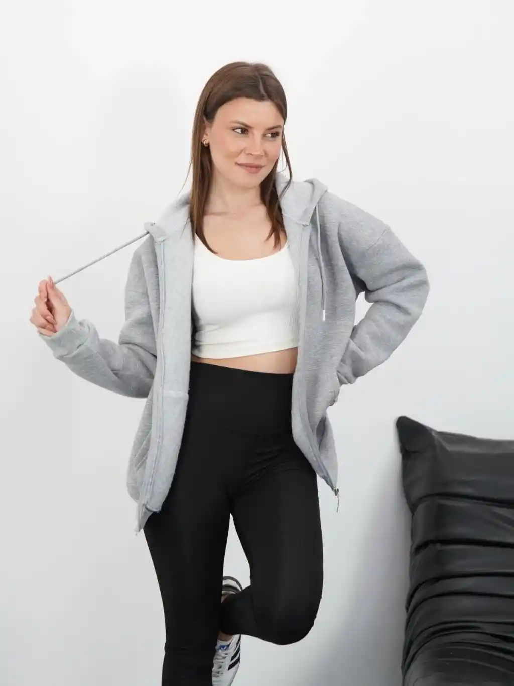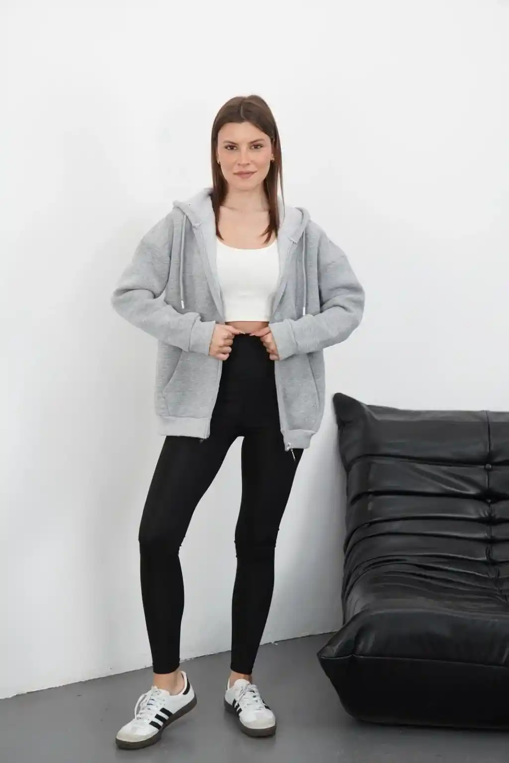 3 iplik şardonlu fermuarlı kapşonlu hırka gri, günlük şıklık ve rahatlık arayan kadınların favorisi olmaya aday bir parçadır.