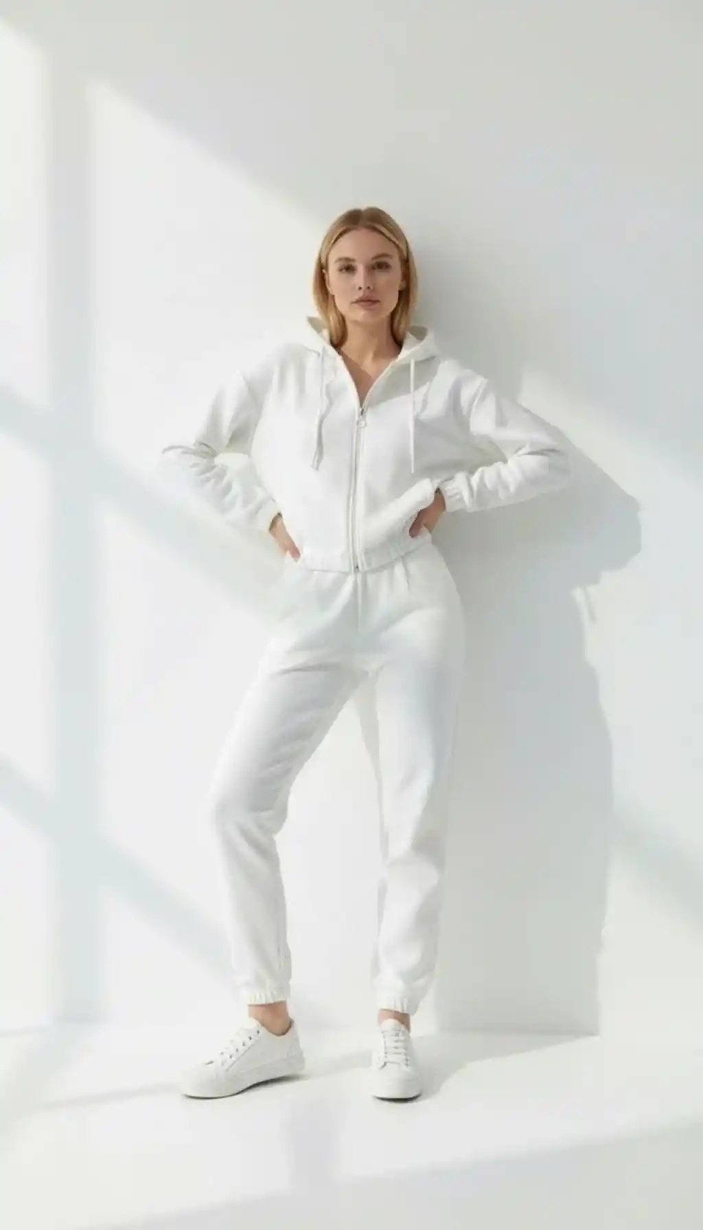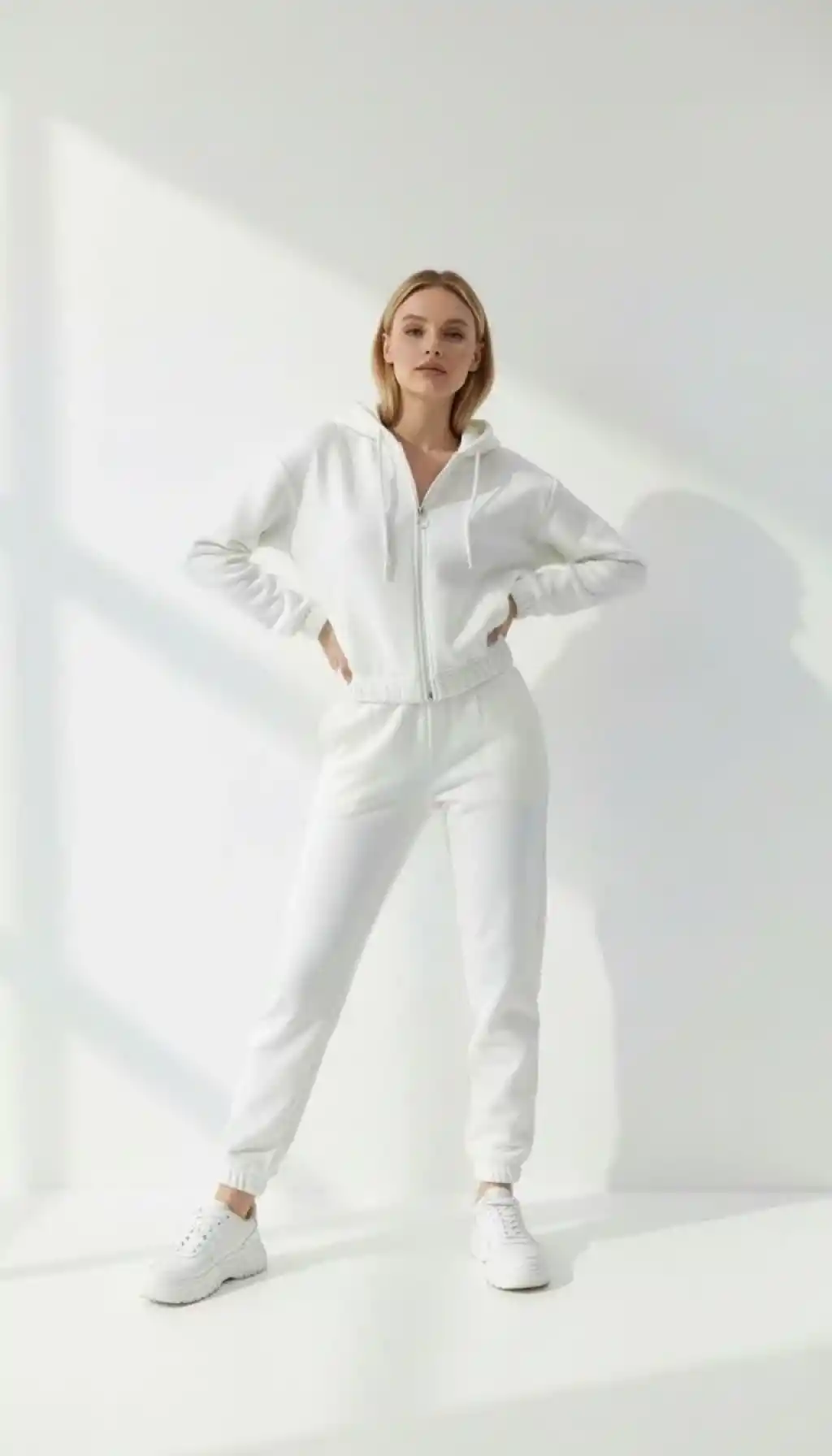 3 iplik şardonlu Kapşonlu fermuarlı kısa üst beyaz pat8590