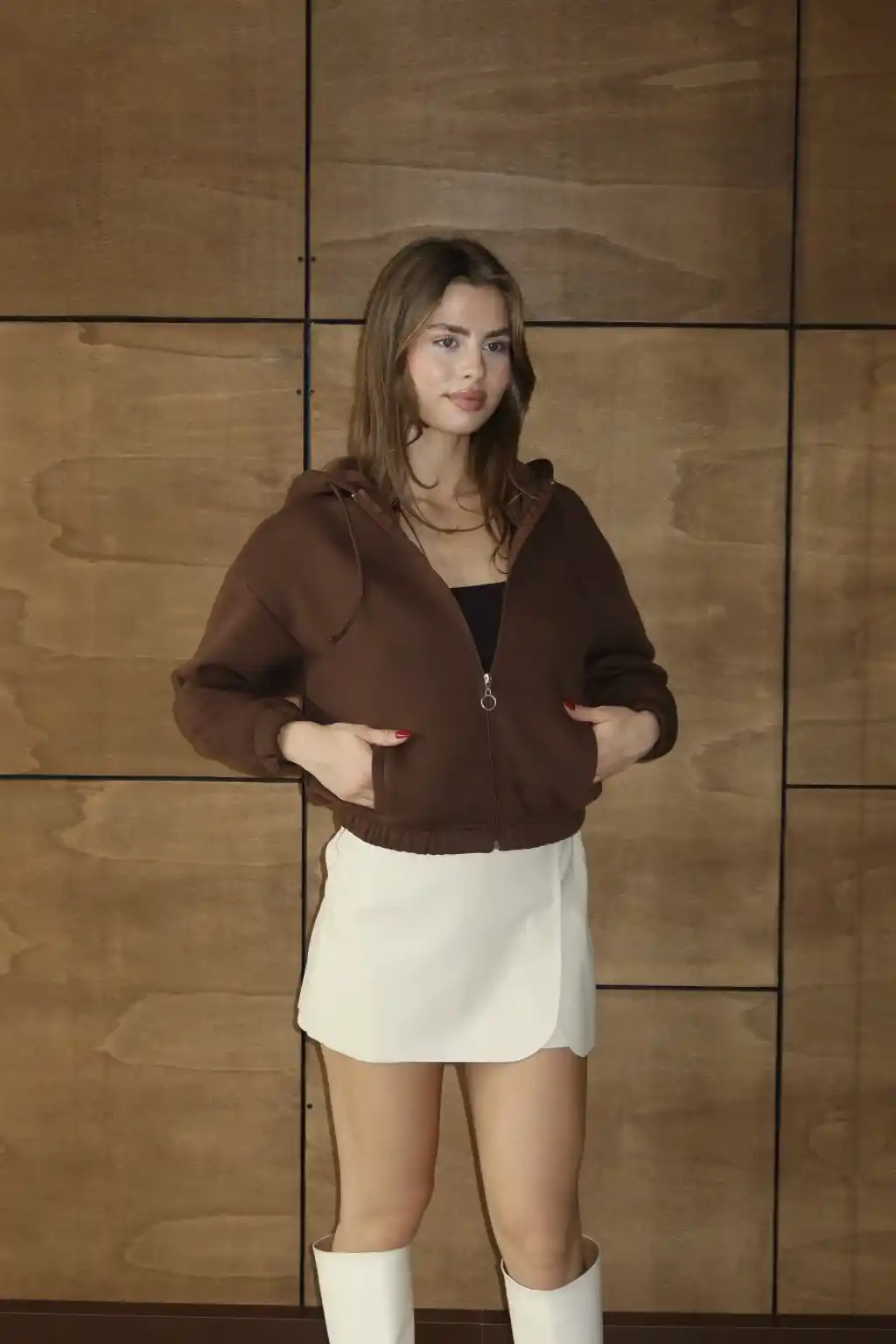 3 iplik şardonlu Kapşonlu fermuarlı kısa üst kahve pat8590