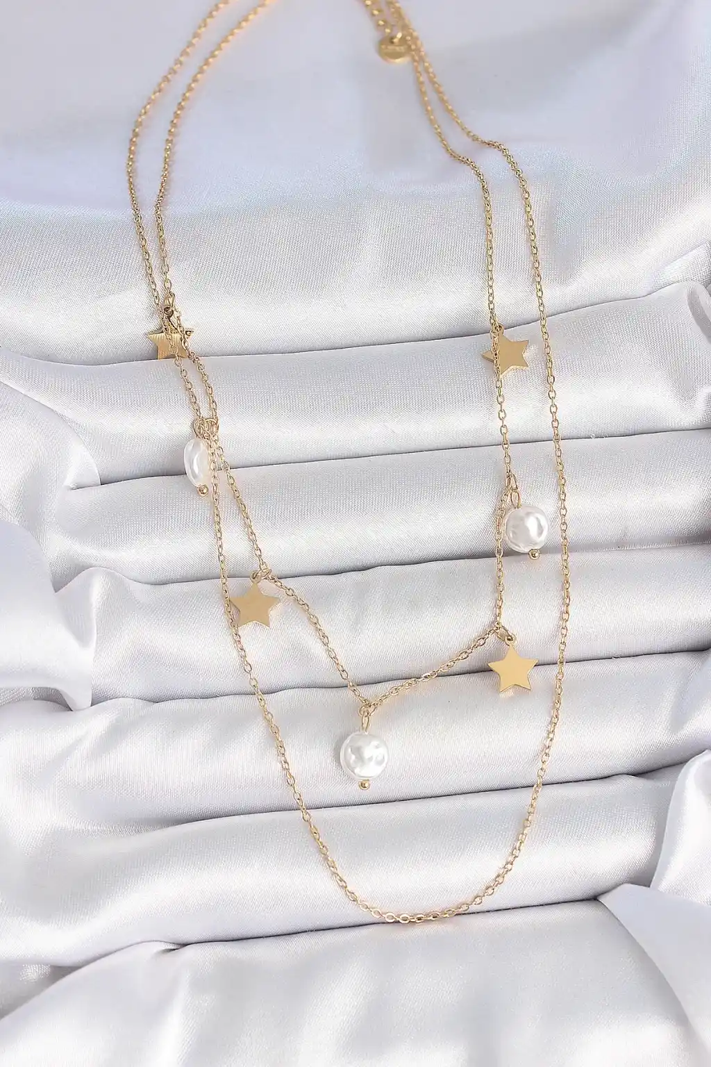 316L Çelik Gold Renk 2'Li Zincir Sallantı Yıldız İnci Model Kadın Kolye