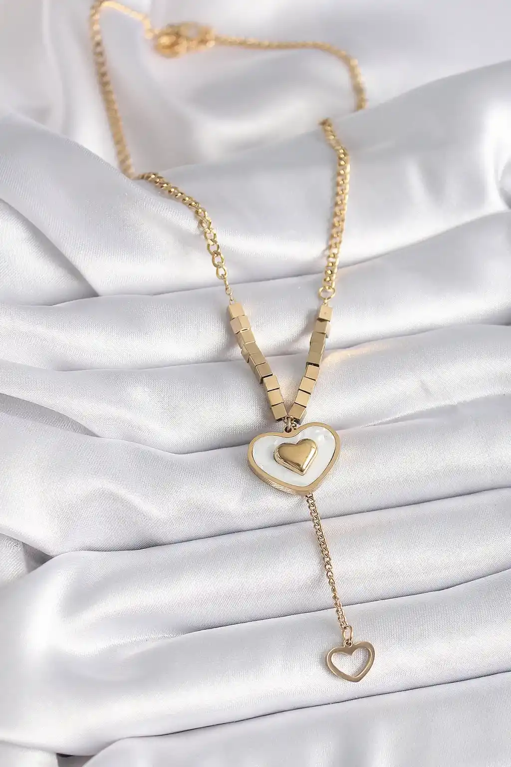 316L Çelik Gold Renk Beyaz Sedefli Kalp Model Sallantı Detay Kadın Kolye