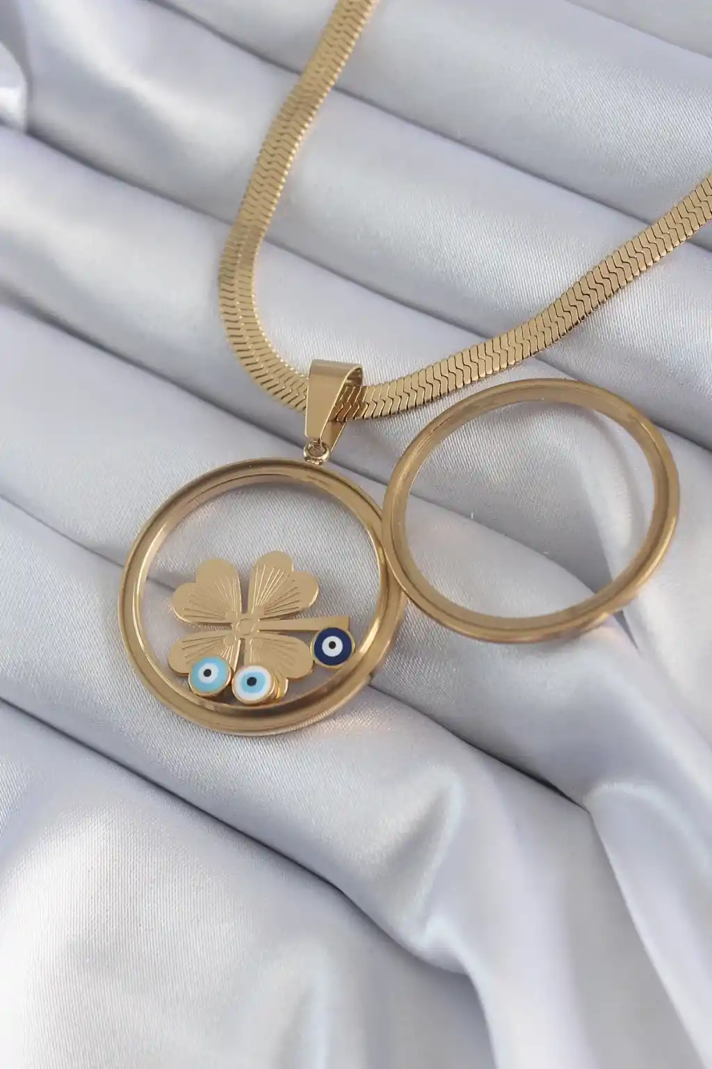 316L Çelik Gold Renk İtalyan Zincir Açılabilir Fanus Yonca Figür Model Kadın Kolye