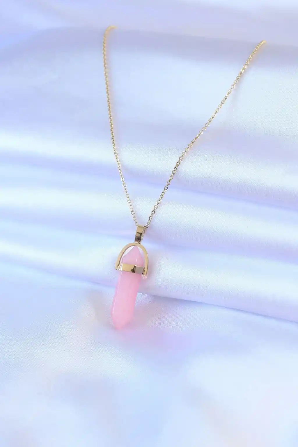 316L Çelik Gold Renk Kristal Pembe Taş Model Kadın kolye