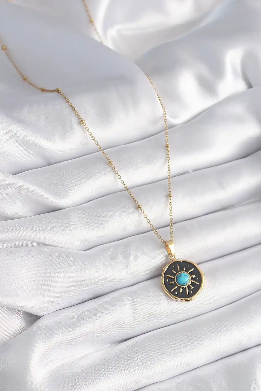 316L Çelik Gold Renk Mavi Boncuk Güneş İşleme Madalyon Model Kadın Kolye