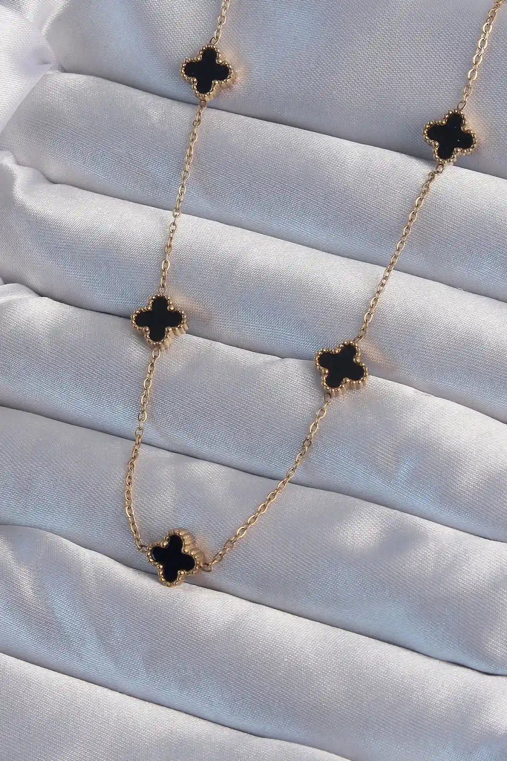 316L Çelik Gold Renk Minimal Siyah Mineli Yonca Kolye