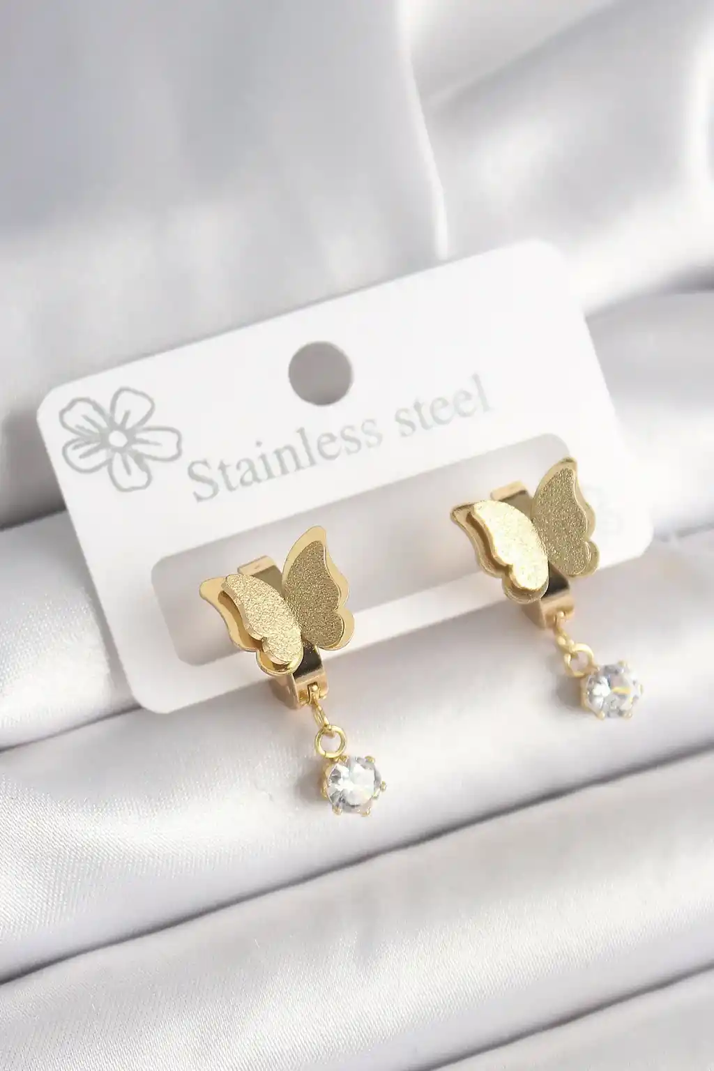 316L Çelik Gold Renk Sallantı Zirkon Taş Detaylı Simli Kelebek Model Kadın Küpe