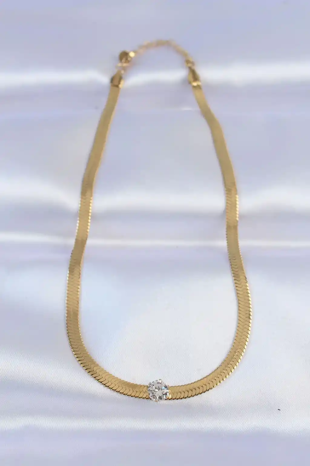 316L Çelik Gold Renk Tek Zirkon Taşlı İtalyan Zincir Kolye
