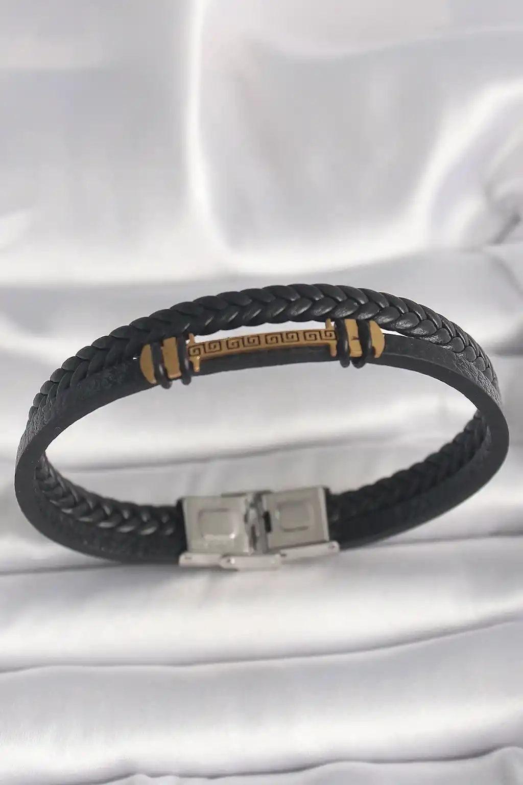 316L Çelik Gold Renk ZikZak İşlemeli Aksesuarlı Çift Sıra Burgu Desenli Deri Kordon Erkek Bileklik