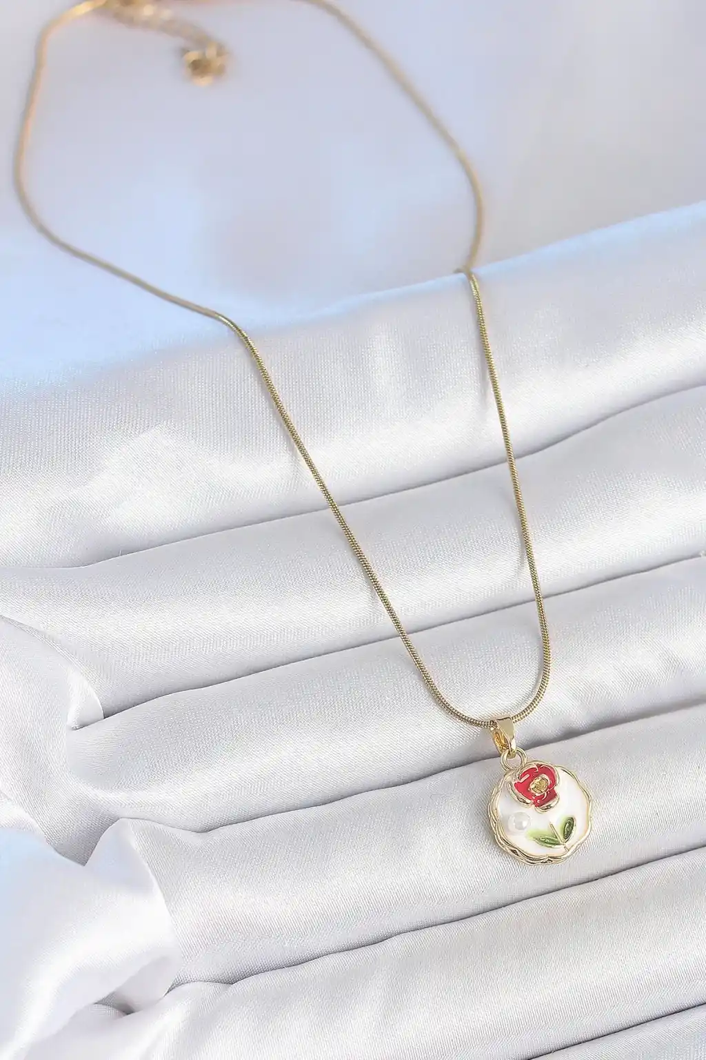 316L Çelik Gold Renk Zincir Beyaz Minimal Çiçek İşlemeli İnci Detay Portre Model Kadın Kolye