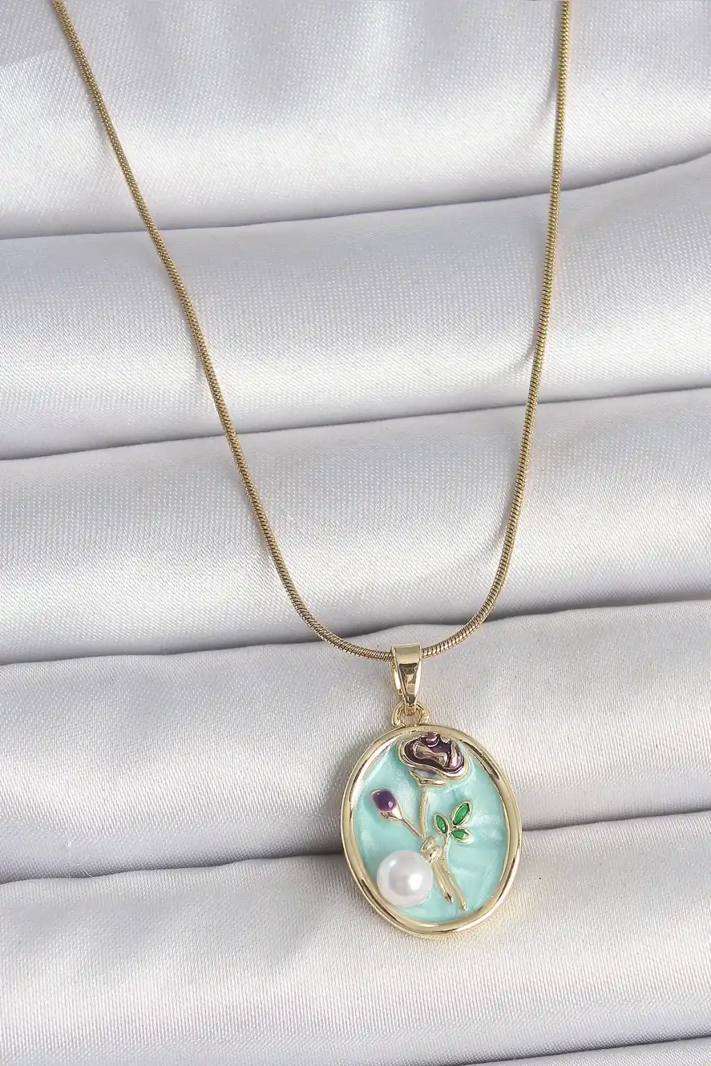 316L Çelik Gold Renk Zincir Mavi Çiçek İşlemeli İnci Detay Portre Model Kadın Kolye