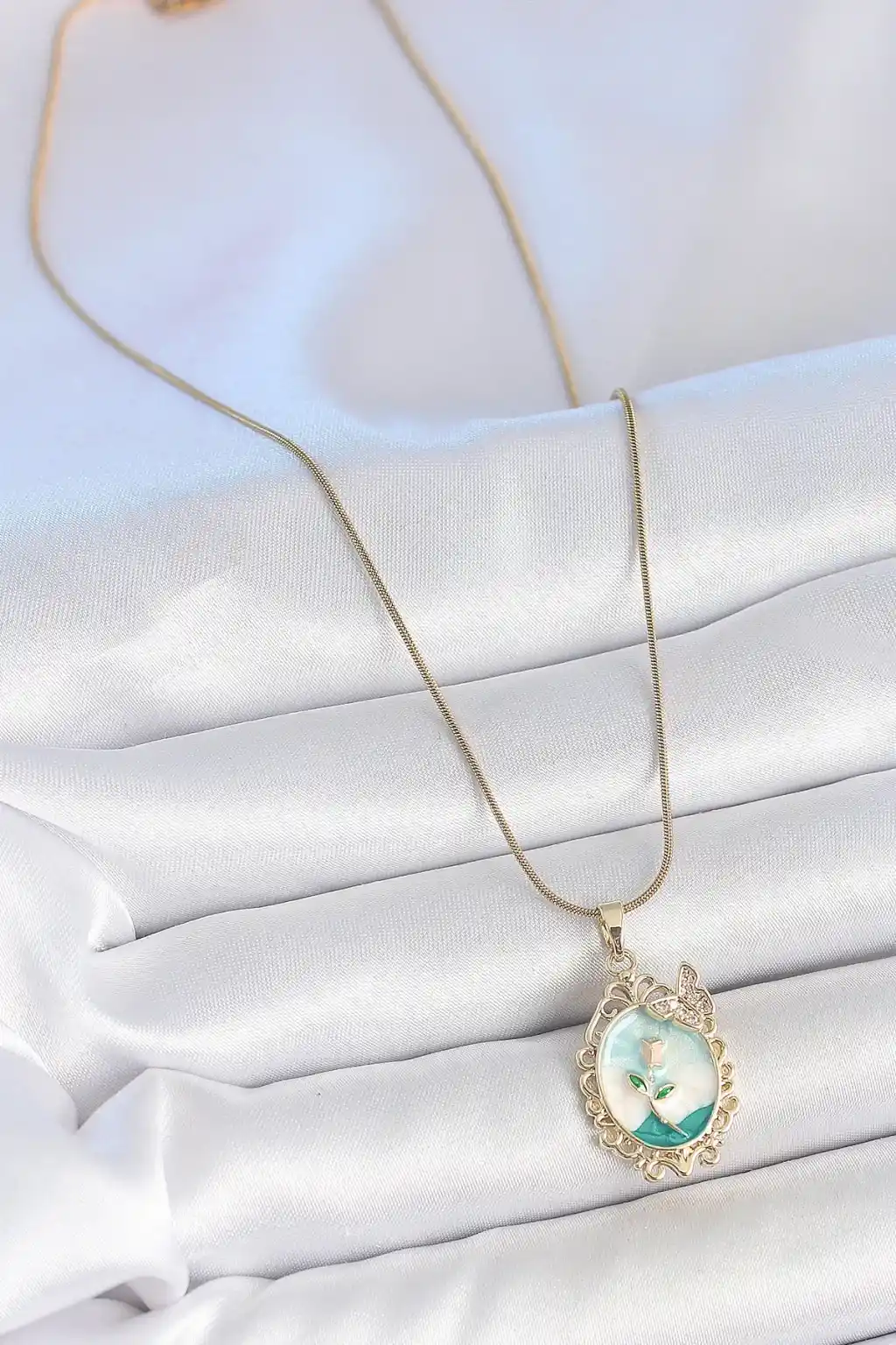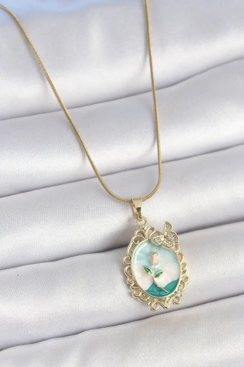 316L Çelik Gold Renk Zincir Mavi Mineli Çiçek İşlemeli Zirkon Taş Detaylı Portre Model Kadın Kolye
