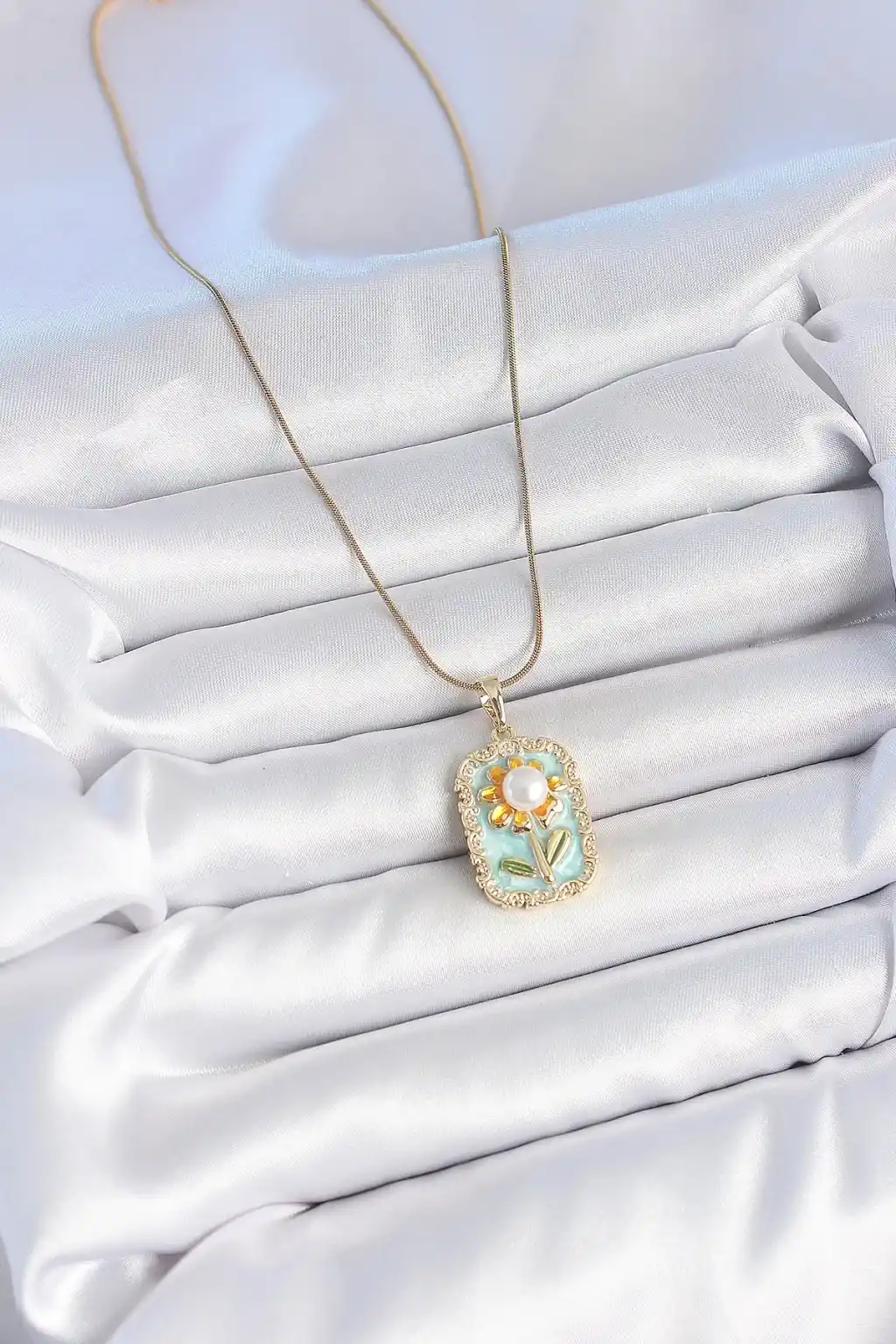 316L Çelik Gold Renk Zincir Mavi Mineli İncili Papatya İşlemeli Portre Model Kadın Kolye
