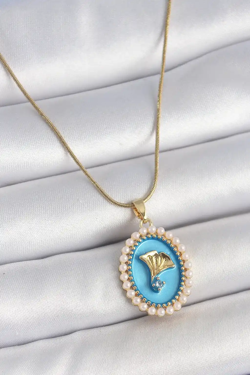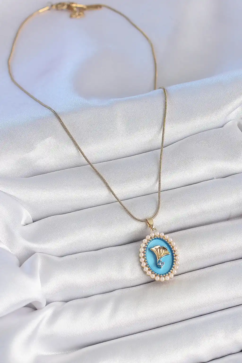 316L Çelik Gold Renk Zincir Mavi Mineli İncili Zirkon Taşlı Çiçek İşlemeli Portre Model Kadın Kolye