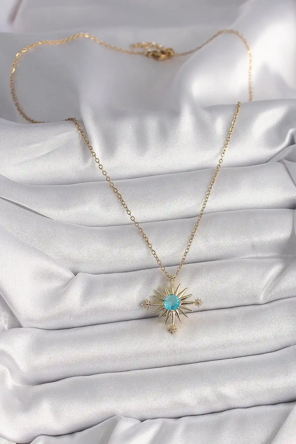 316L Çelik Gold Renk Zincir Mavi Taş Detaylı Kuzey Yıldız Model Kadın Kolye