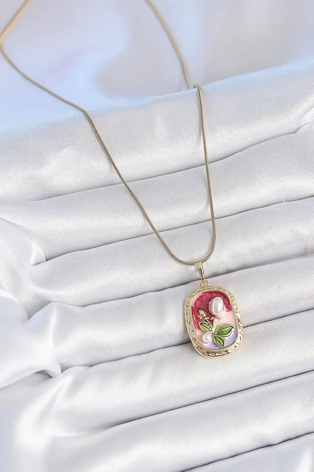 316L Çelik Gold Renk Zincir Mix Renk İncili Çiçek İşlemeli Portre Model Kadın Kolye
