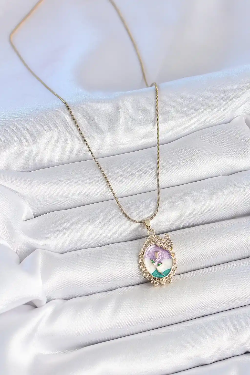 316L Çelik Gold Renk Zincir Mix Renk Mineli Çiçek İşlemeli Zirkon Taş Detaylı Portre Model Kadın Kolye