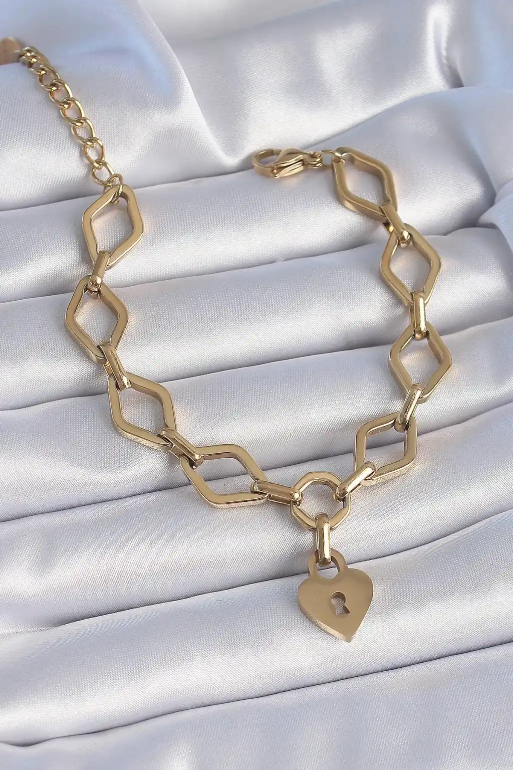 316L Çelik Gold Renk Zincir Model Kilit Kalp Figür Kadın Bileklik