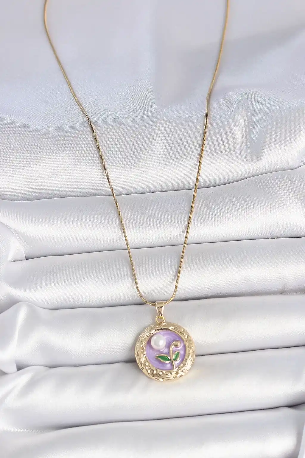 316L Çelik Gold Renk Zincir Mor Çiçek İşlemeli İnci Detay Potre Model Kadın Kolye