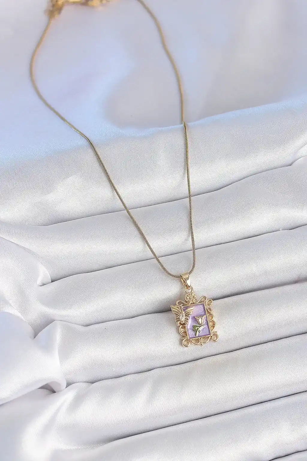 316L Çelik Gold Renk Zincir Mor Mineli Çiçek İşlemeli Zirkon Taşlı Kelebek Detay Portre Model Kadın Kolye