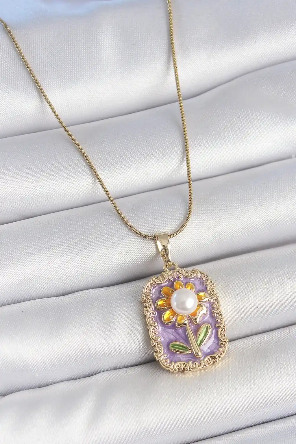 316L Çelik Gold Renk Zincir Mor Mineli İncili Papatya İşlemeli Portre Model Kadın Kolye