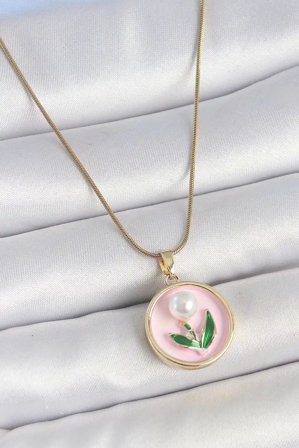 316L Çelik Gold Renk Zincir Pembe Mineli İncili Çiçek İşlemeli Portre Model Kadın Kolye