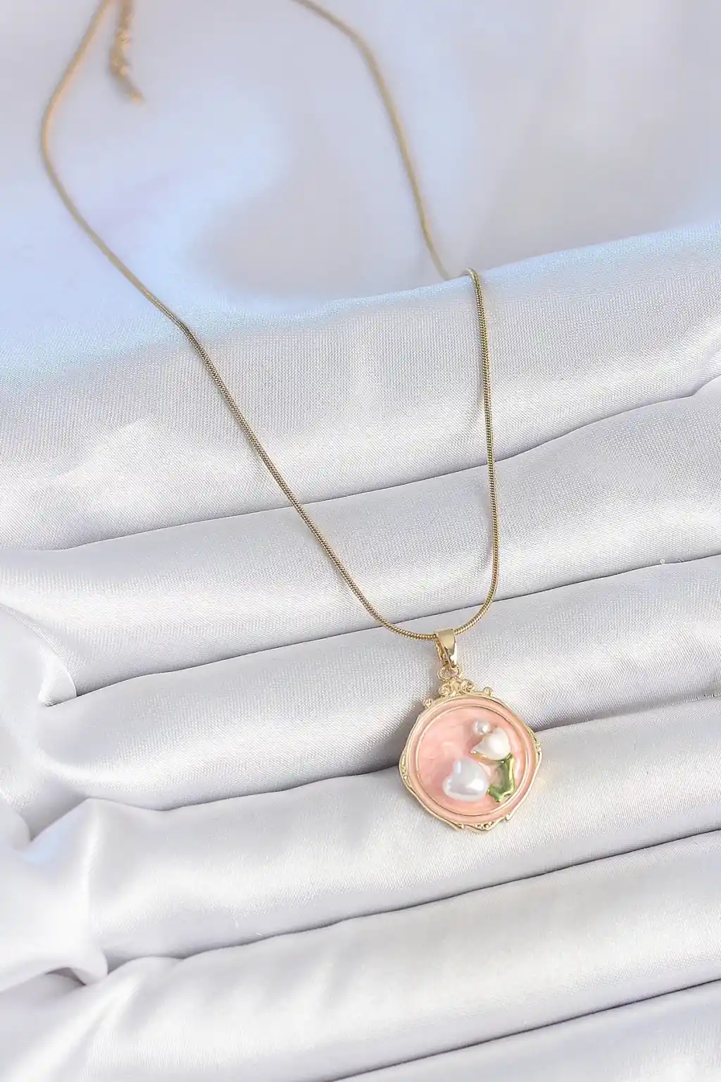 316L Çelik Gold Renk Zincir Pembe Mineli İncili Çiçek İşlemeli Portre Model Kadın Kolye