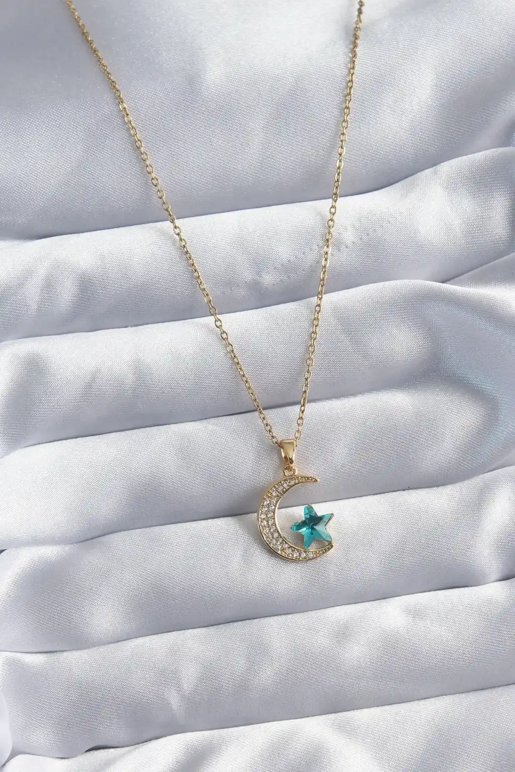 316L Çelik Gold Renk Zincir Zirkon Taş Detay Hilal Yıldızı Figür Kadın Kolye