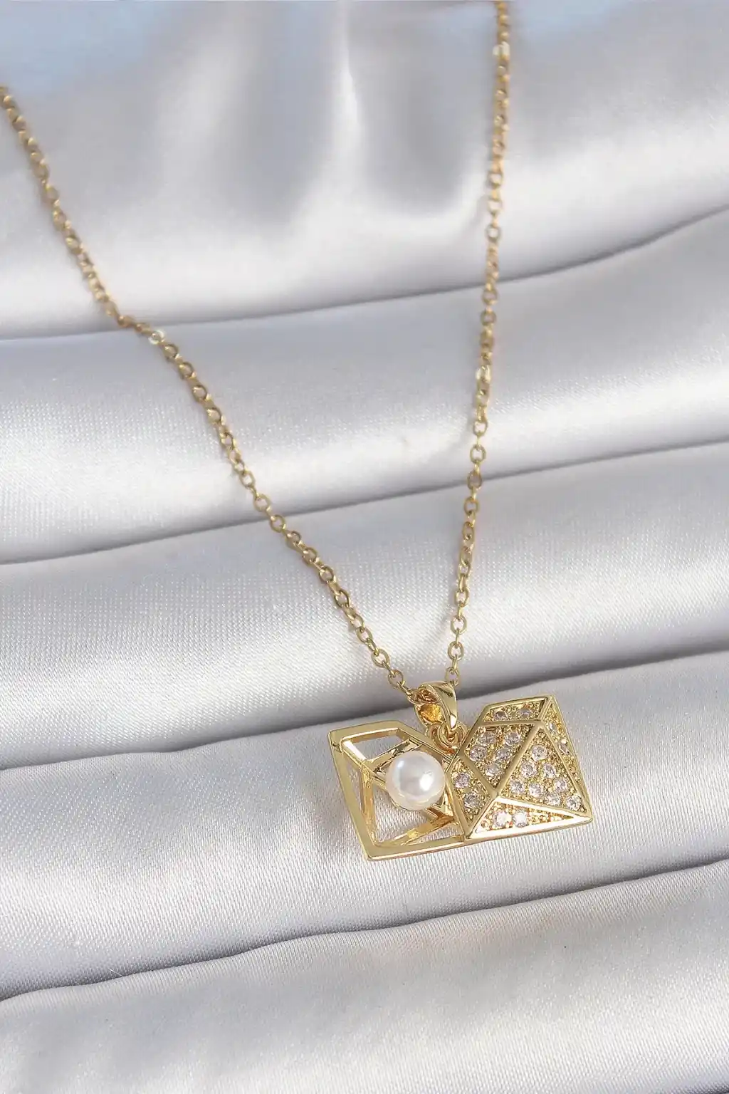316L Çelik Gold Renk Zincir Zirkon Taşlı Açılır İncili Elmas Model Kadın Kolye