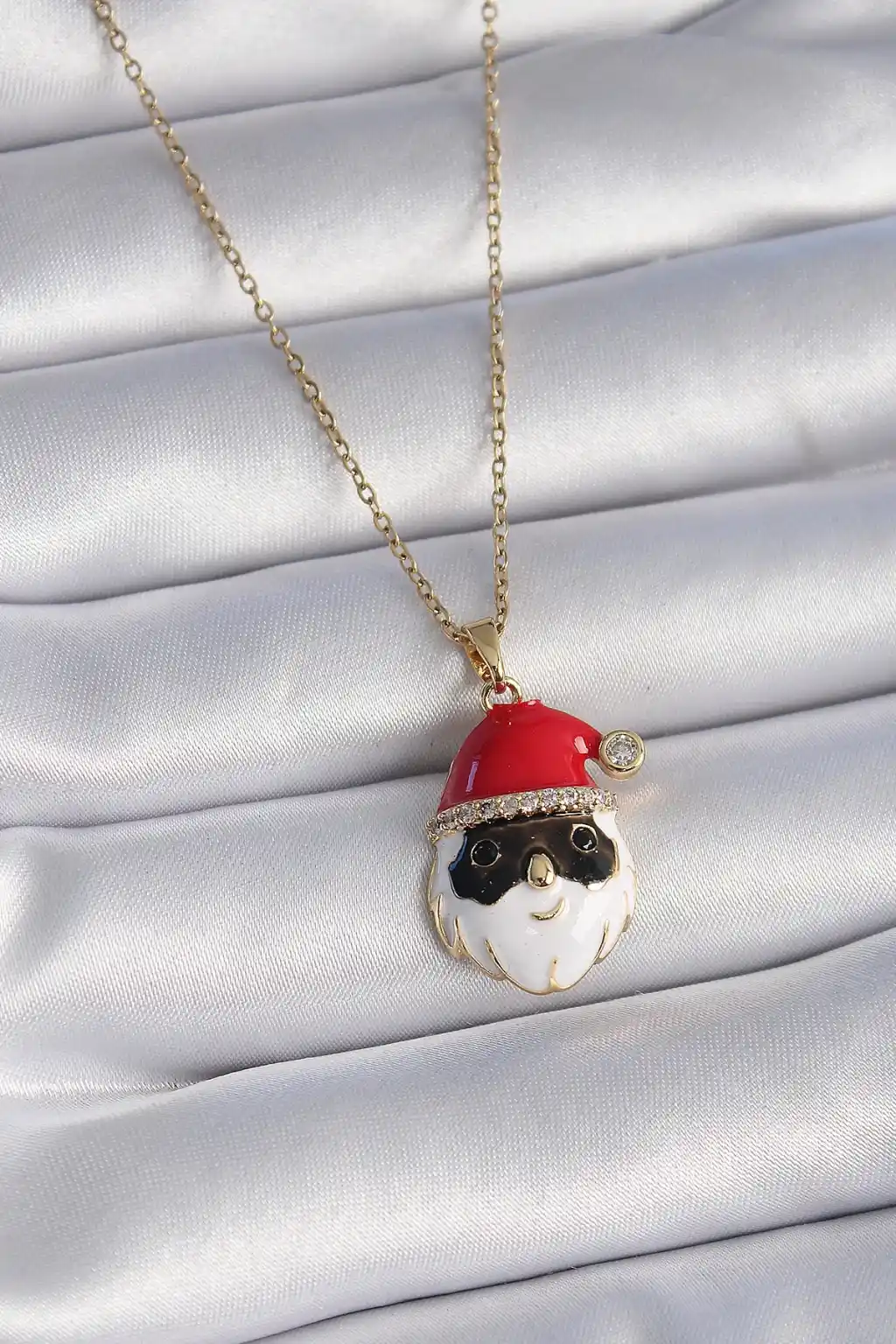 316L Çelik Gold Renk Zincir Zirkon Taşlı Yılbaşı Temalı Noel Baba Figür Kadın Kolye