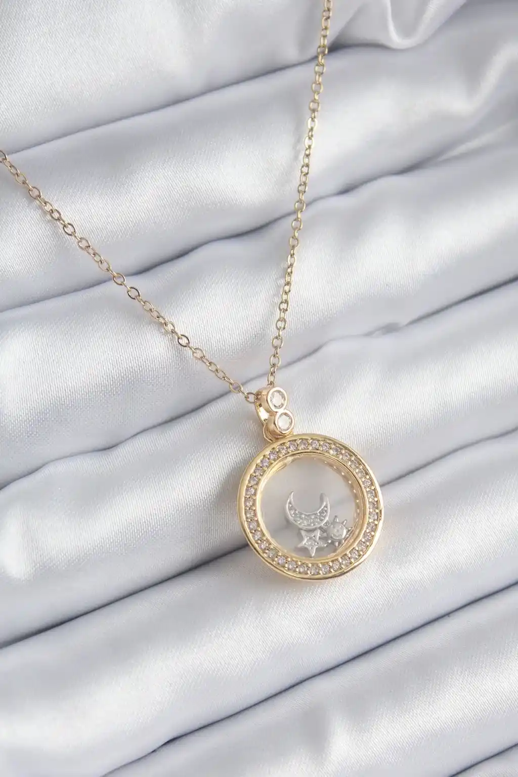 316L Çelik Gold Renk Zirkon Taş Detay Ay Yıldız Fanus Model Kadın Kolye