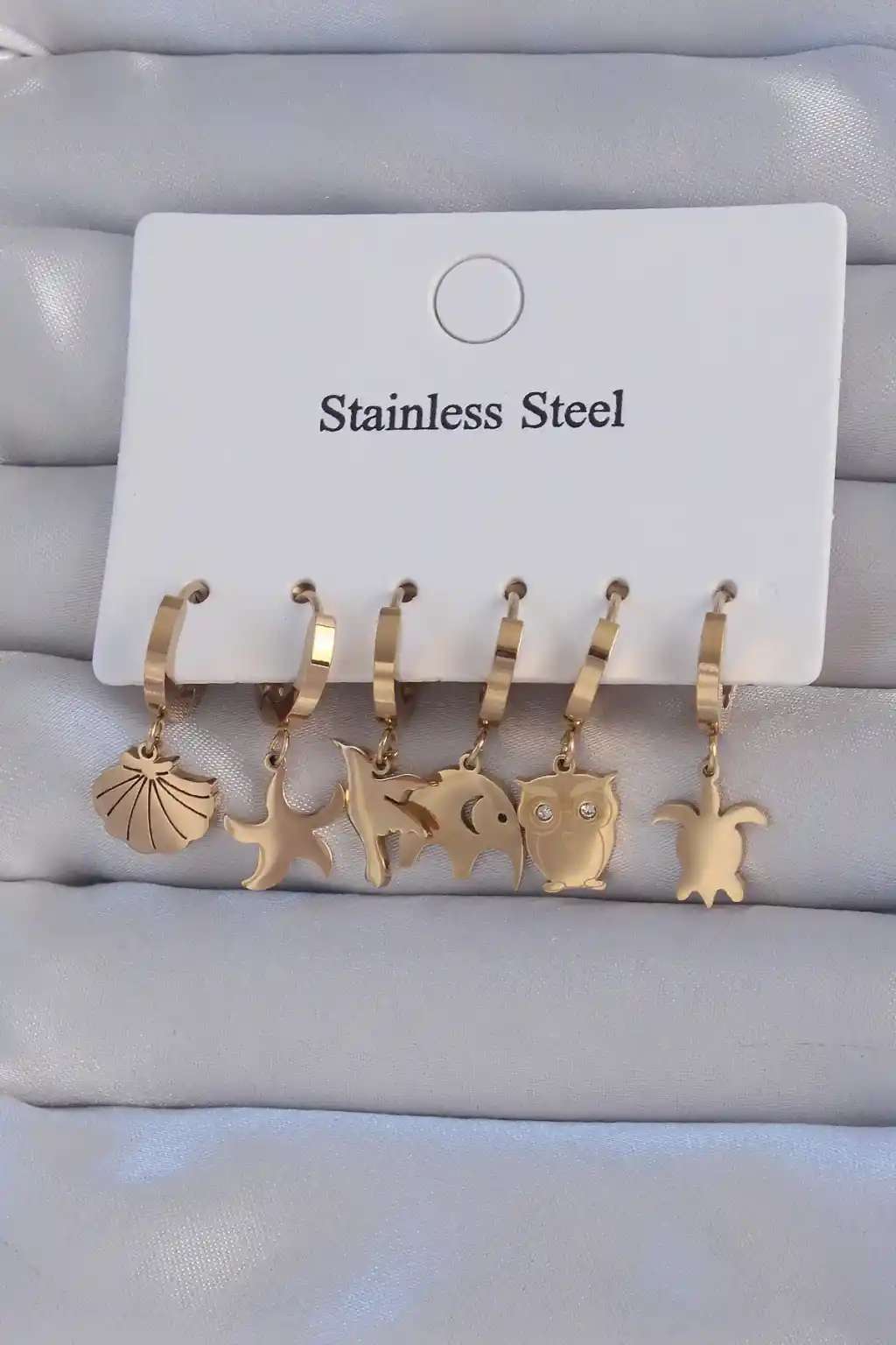 316L Çelik Gold Renk Zirkon Taşlı Hayvan Figürlü Deniz Yıldızı Model Halka Küpe Seti