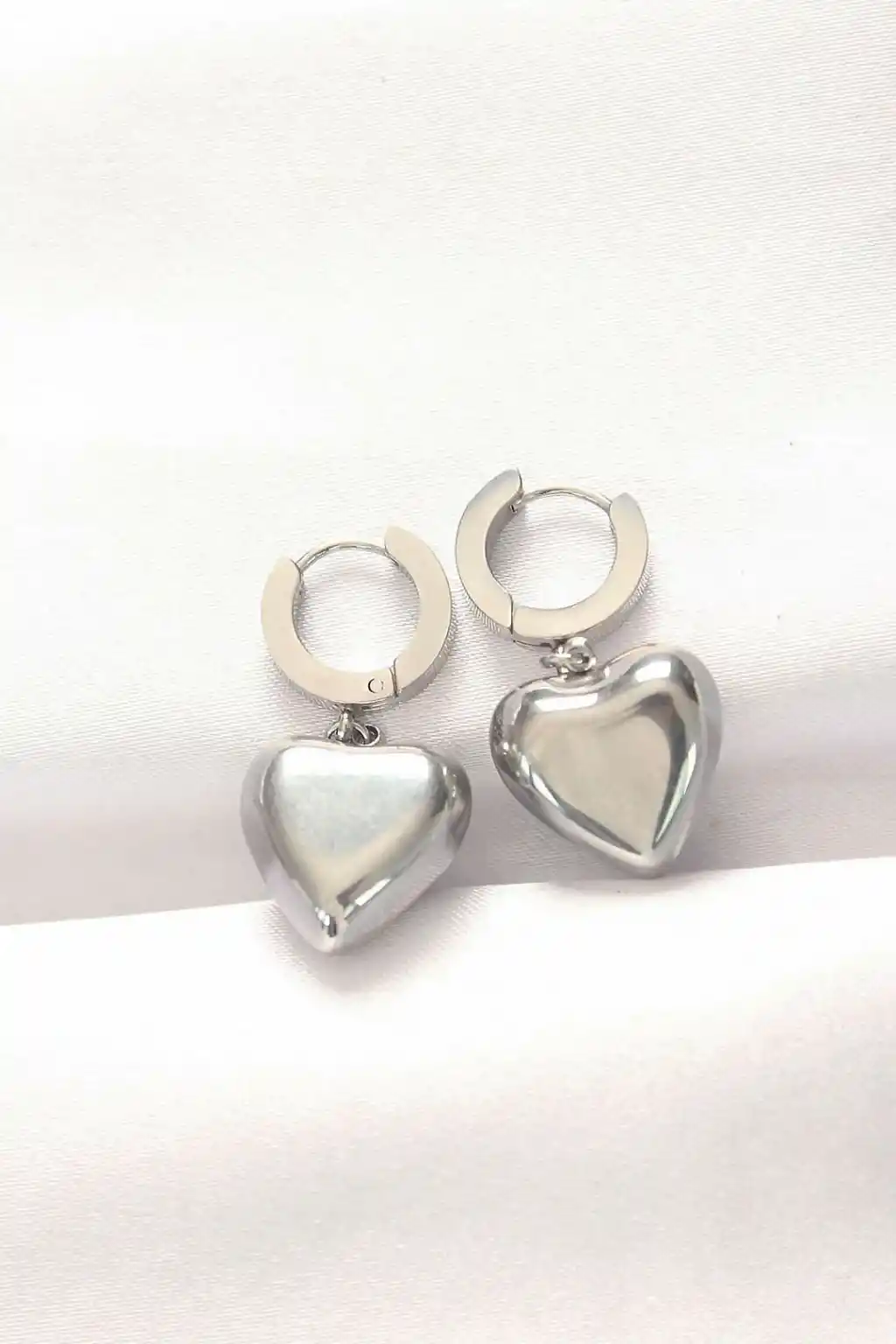 316L Çelik Gümüş Renk Bombeli Kalp Tasarımlı Küpe