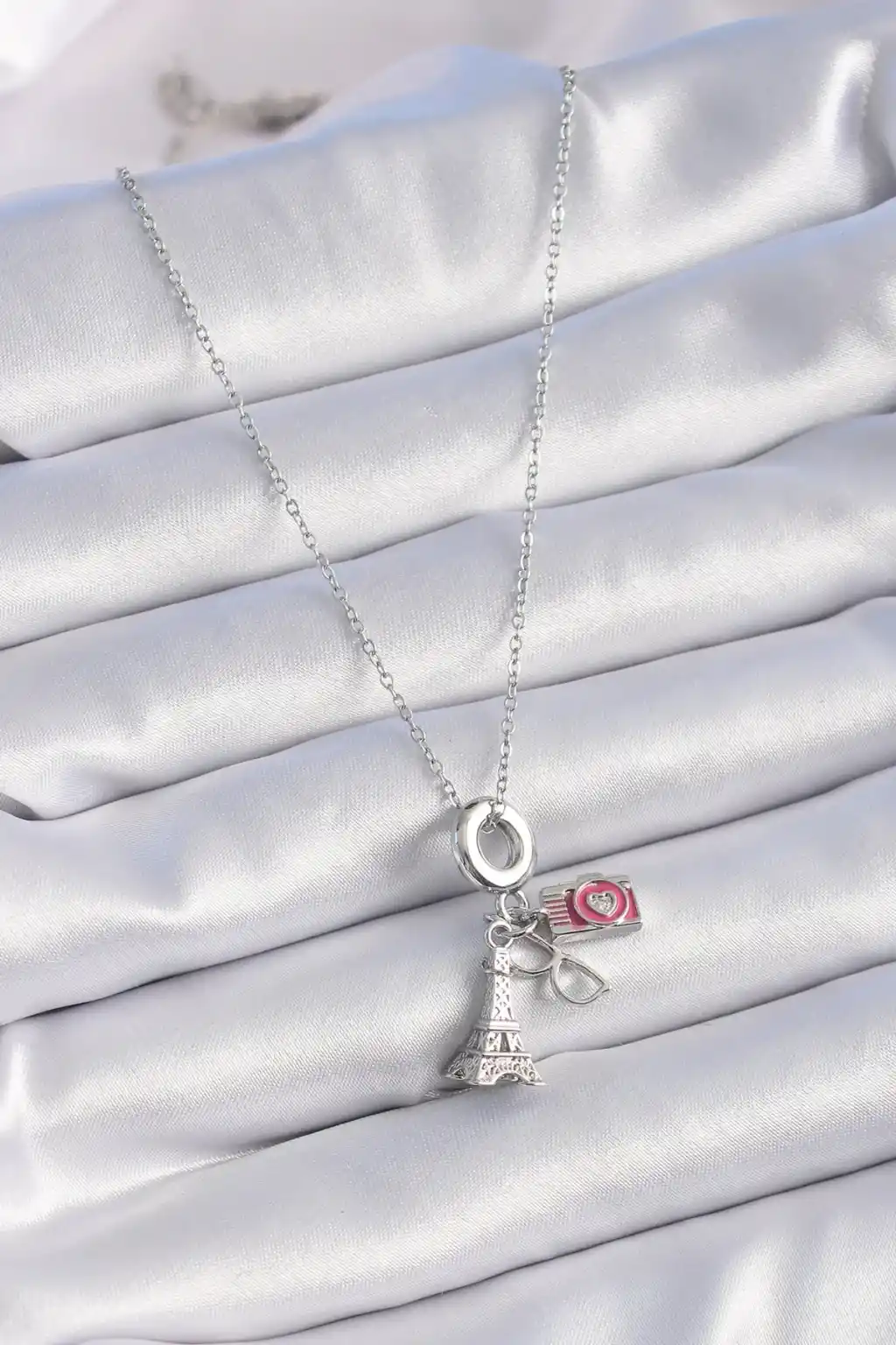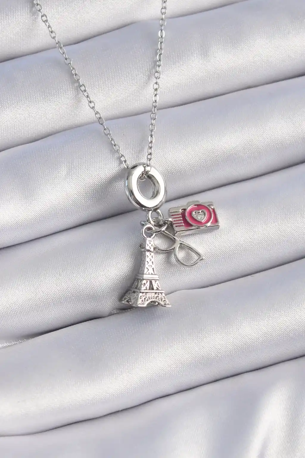 316L Çelik Gümüş Renk Eyfel Kule Fotoğraf Makinesi Model Charm Kadın Kolye