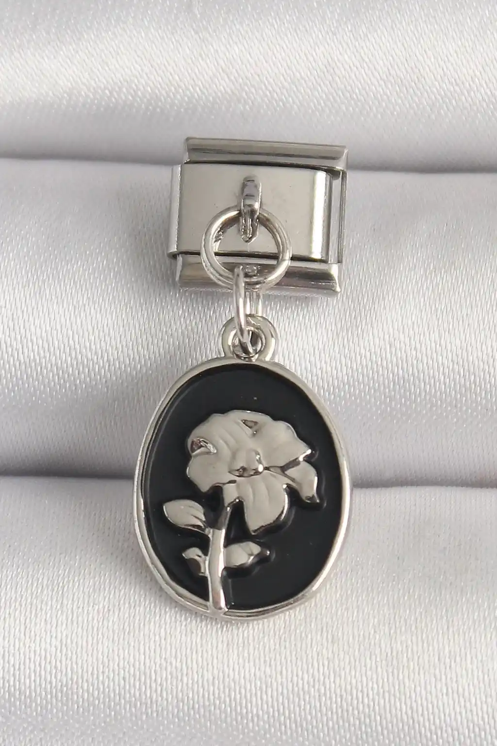 316L Çelik Gümüş Renk Gümüş Çiçek İşlemeli Siyah Portre Model Nomination Charm