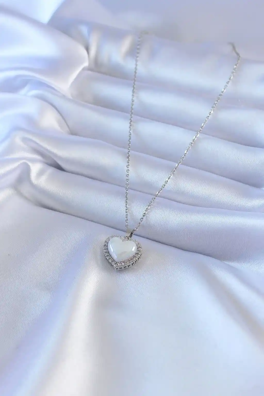 316L Çelik Gümüş Renk İncili Kalp Model Zirkon Taşlı Kadın Kolye