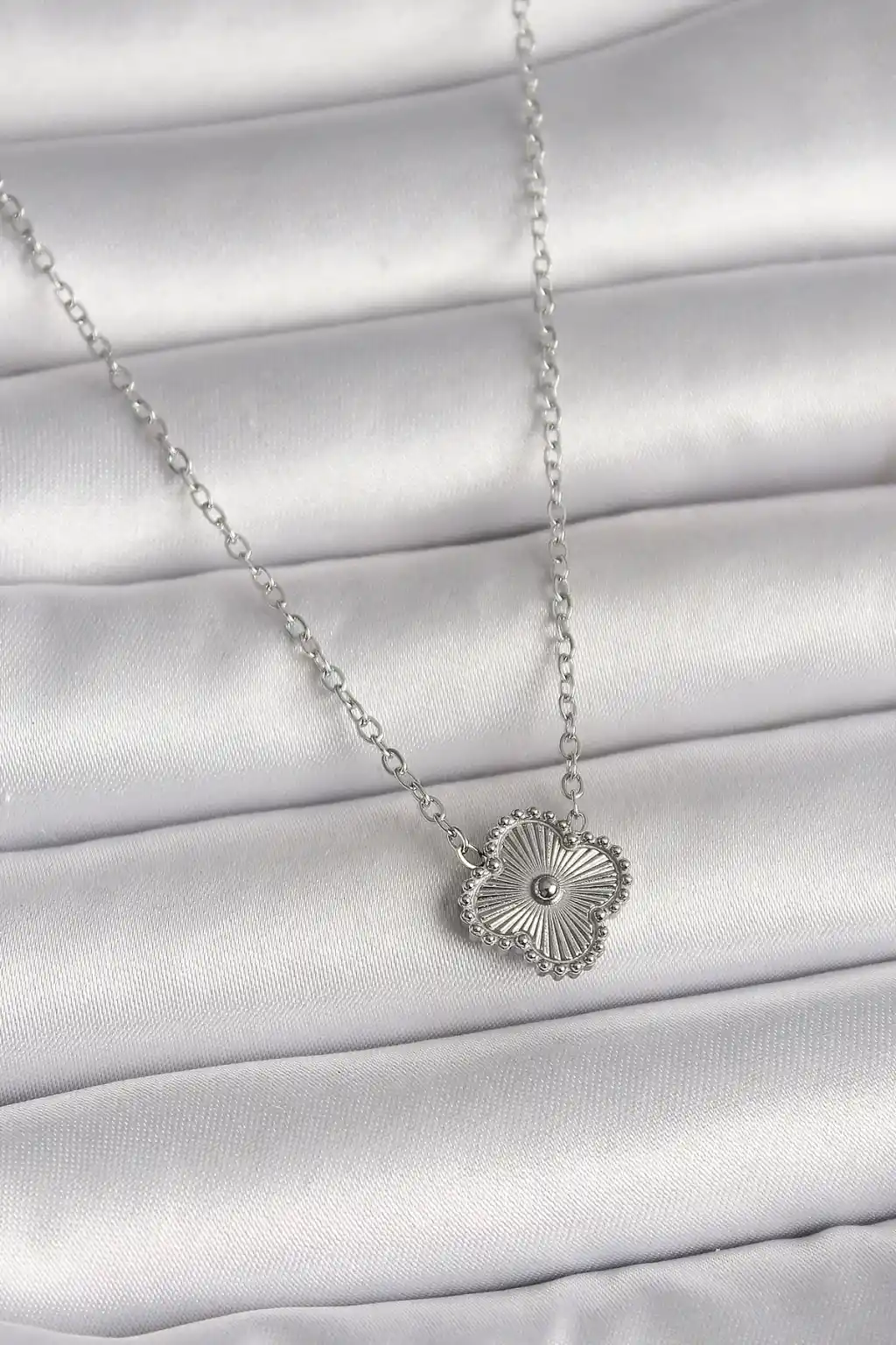 316L Çelik Gümüş Renk İşleme Detaylı Yonca Model Kadın Kolye