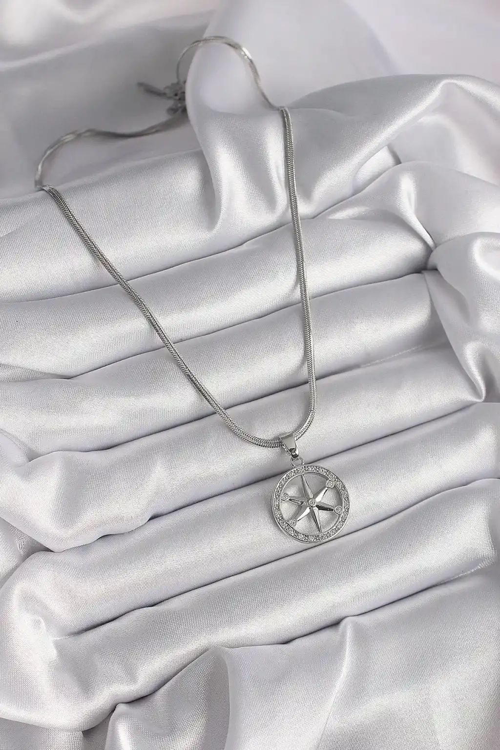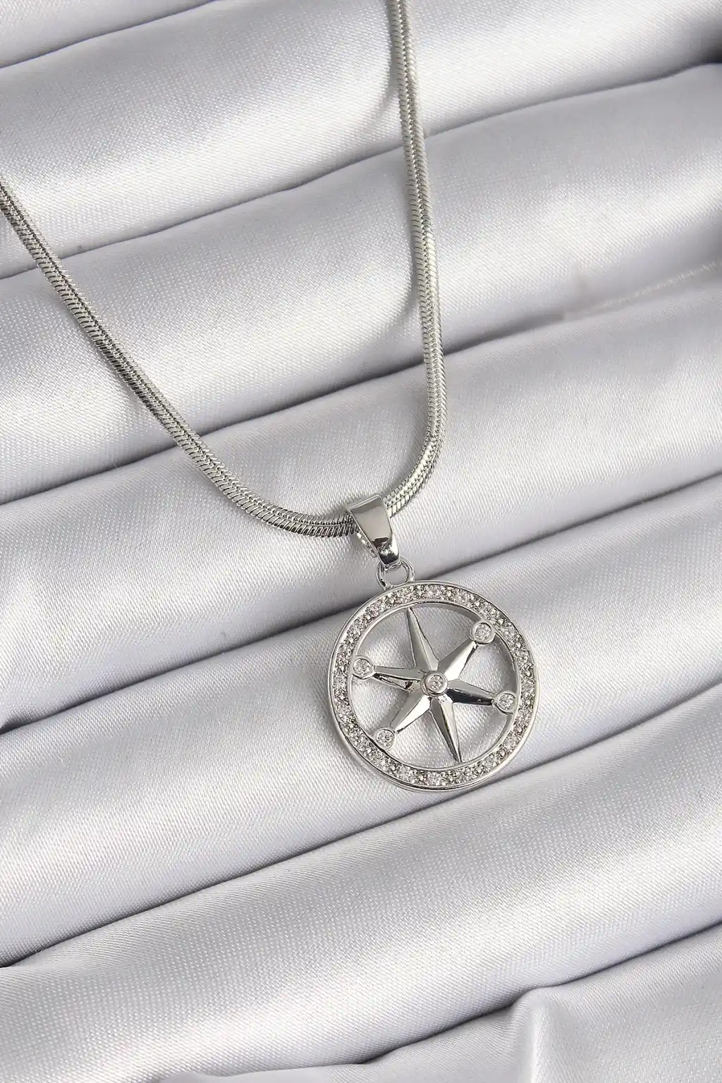 316L Çelik Gümüş Renk İtalyan Zincir Zirkon Taşlı Kutup Yıldız Model Kadın Kolye