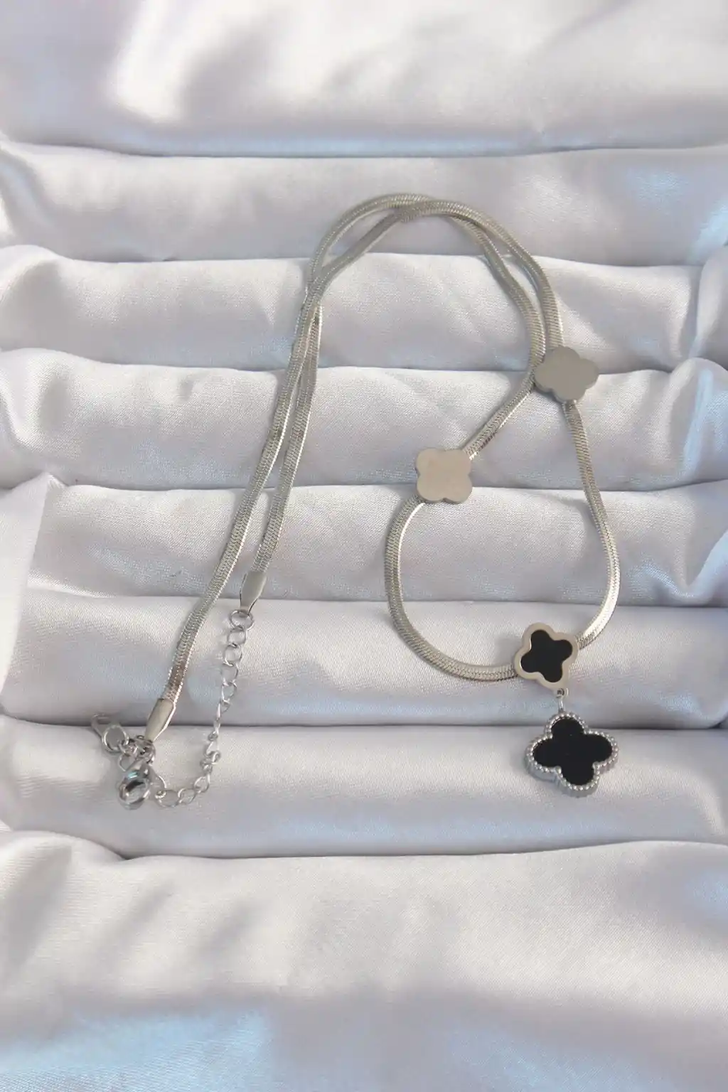 316L Çelik Gümüş Renk İtalyan Zincirli Mineli Yonca Kolye