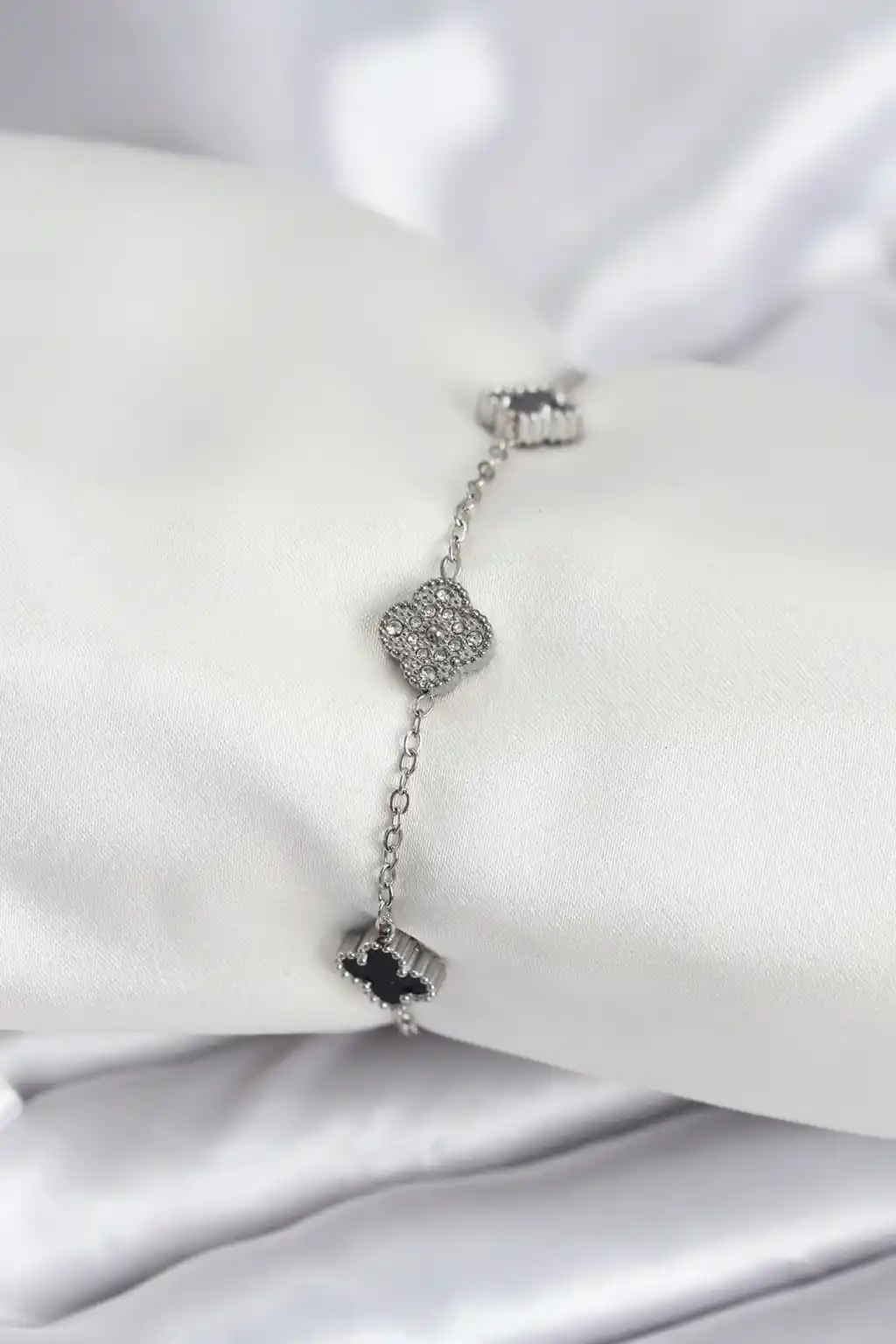 316L Çelik Gümüş Renk Siyah ve Zirkon Taşlı Baby Boy Yonca Kadın Bileklik