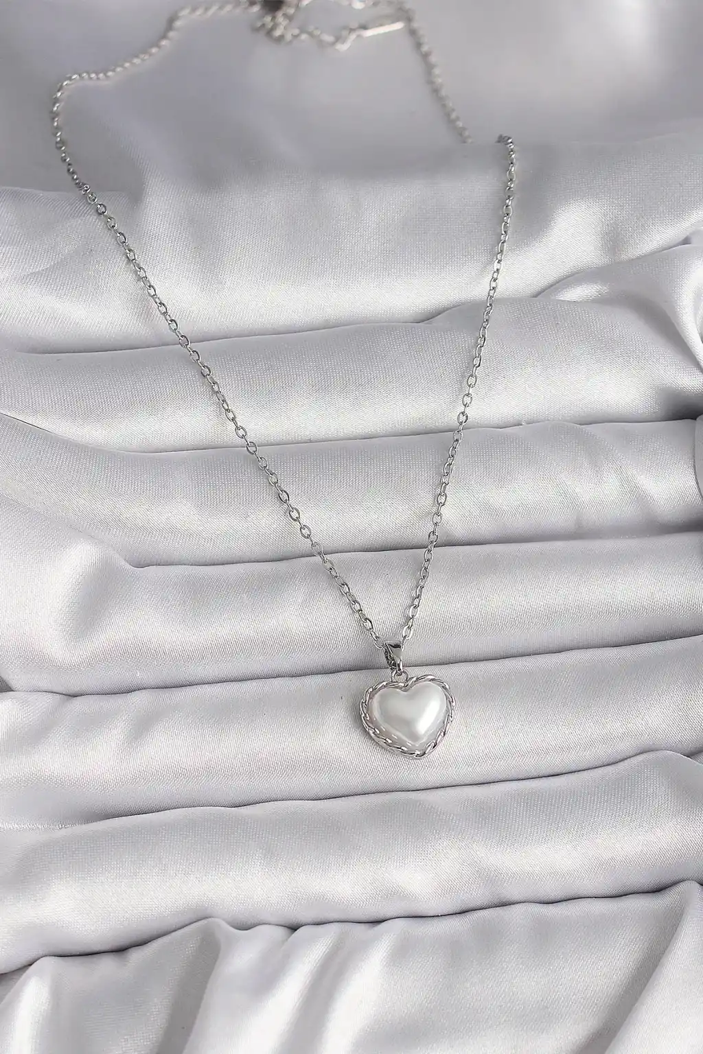316L Çelik Gümüş Renk Zincir 3D İnci Kalp Model Kadın Kolye