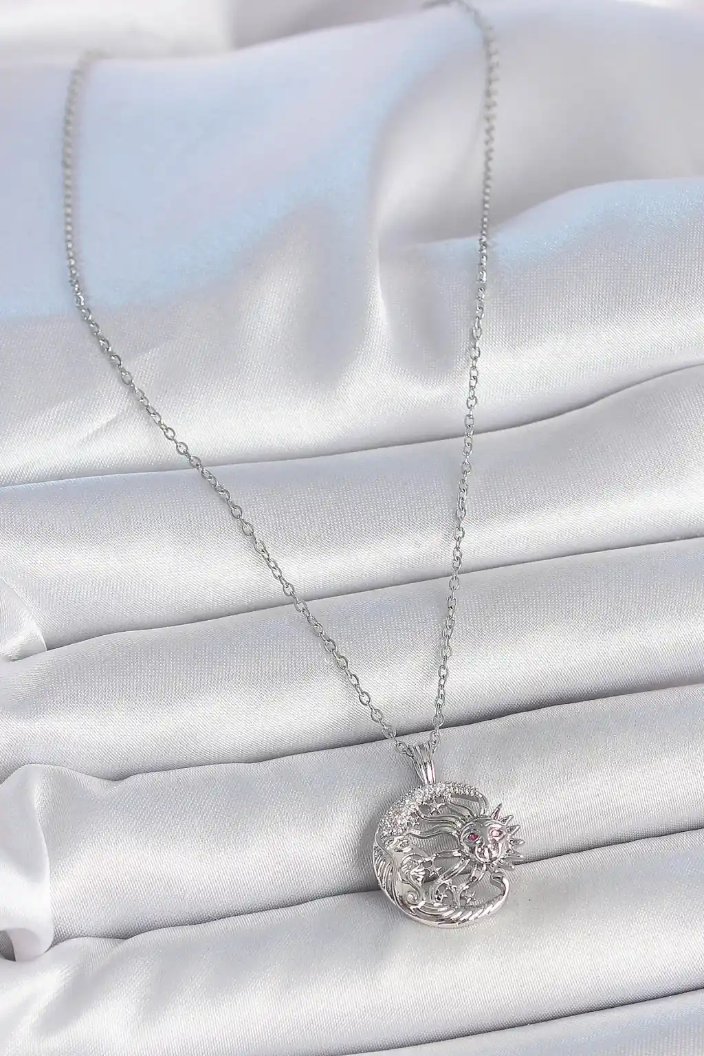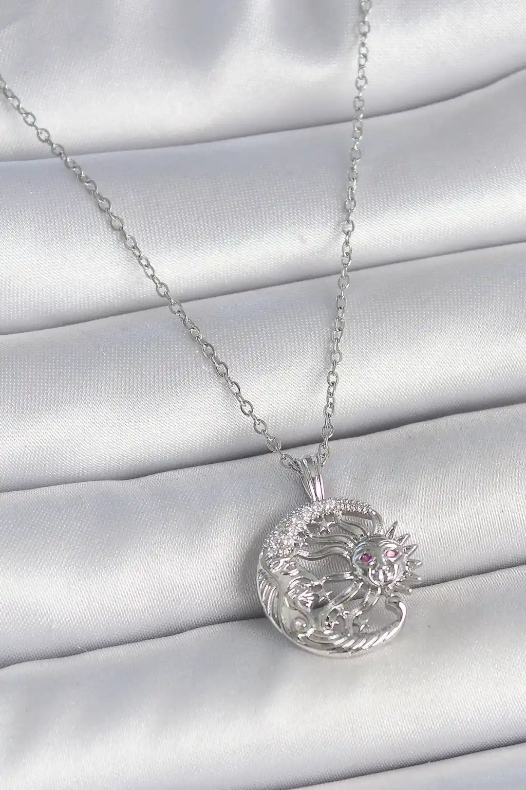 316L Çelik Gümüş Renk Zincir Ay Güneş Model Zirkon Taş Detay Kadın Kolye
