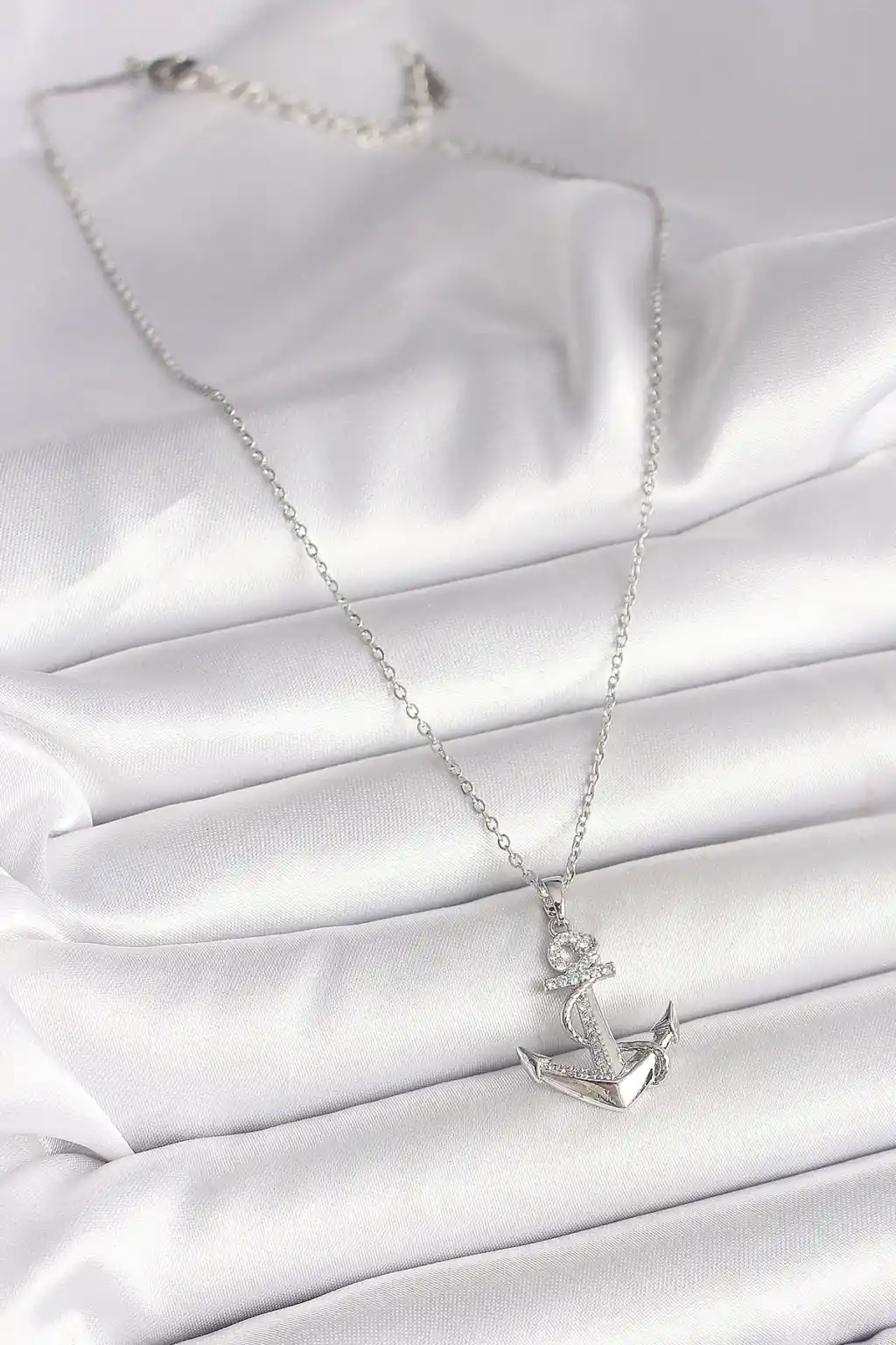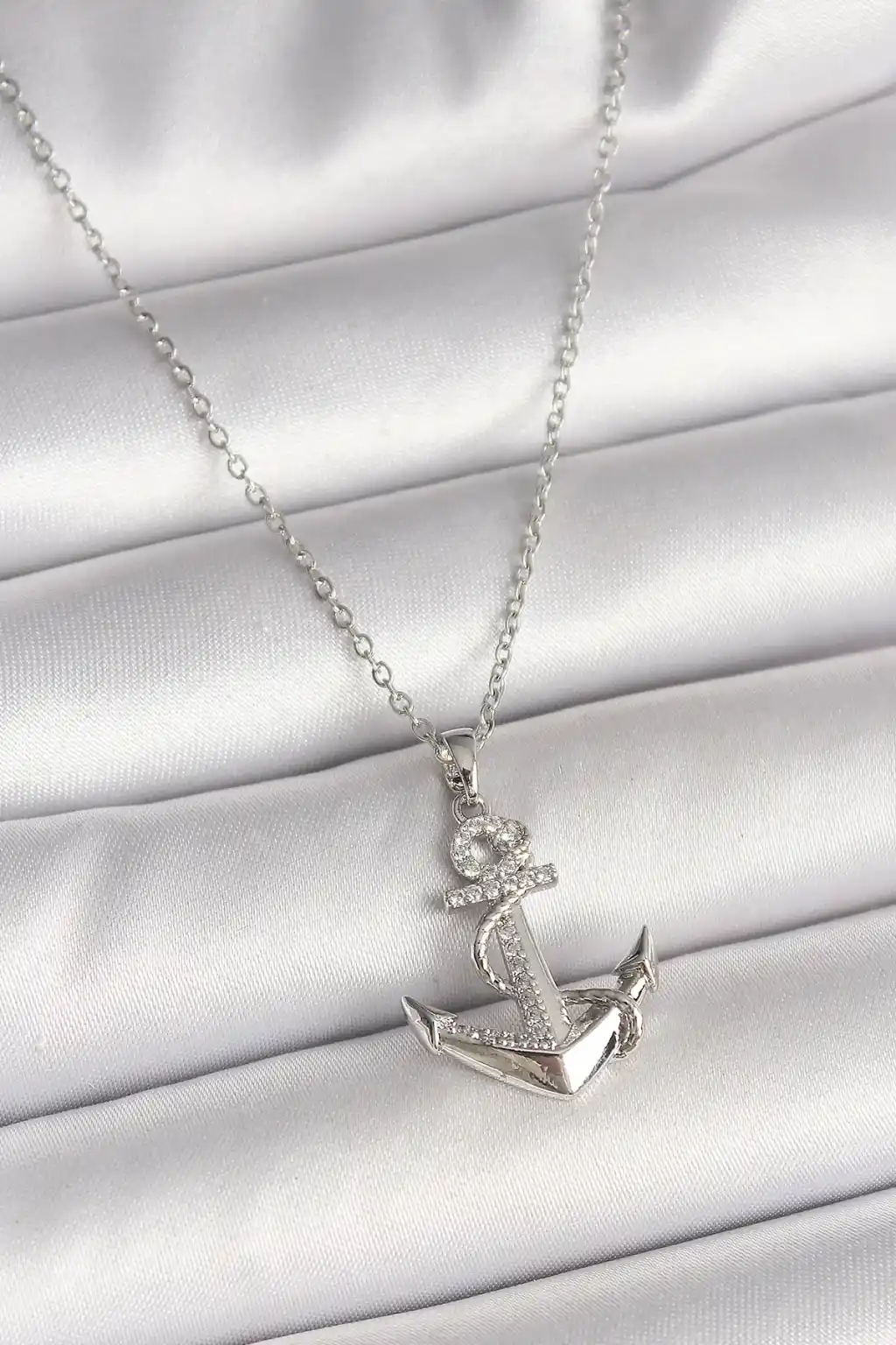 316L Çelik Gümüş Renk Zincir Zirkon Taş Detaylı Çapa Model Kadın Kolye