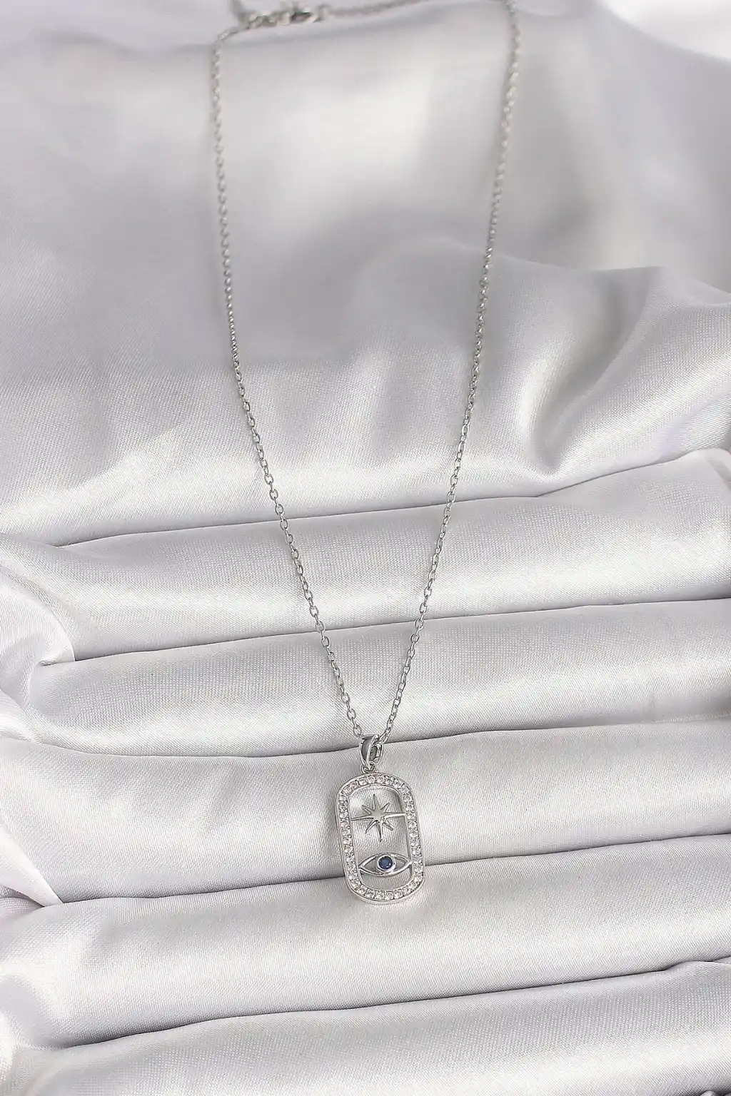 316L Çelik Gümüş Renk Zincir Zirkon Taşlı Göz Yıldız Model Kadın Kolye