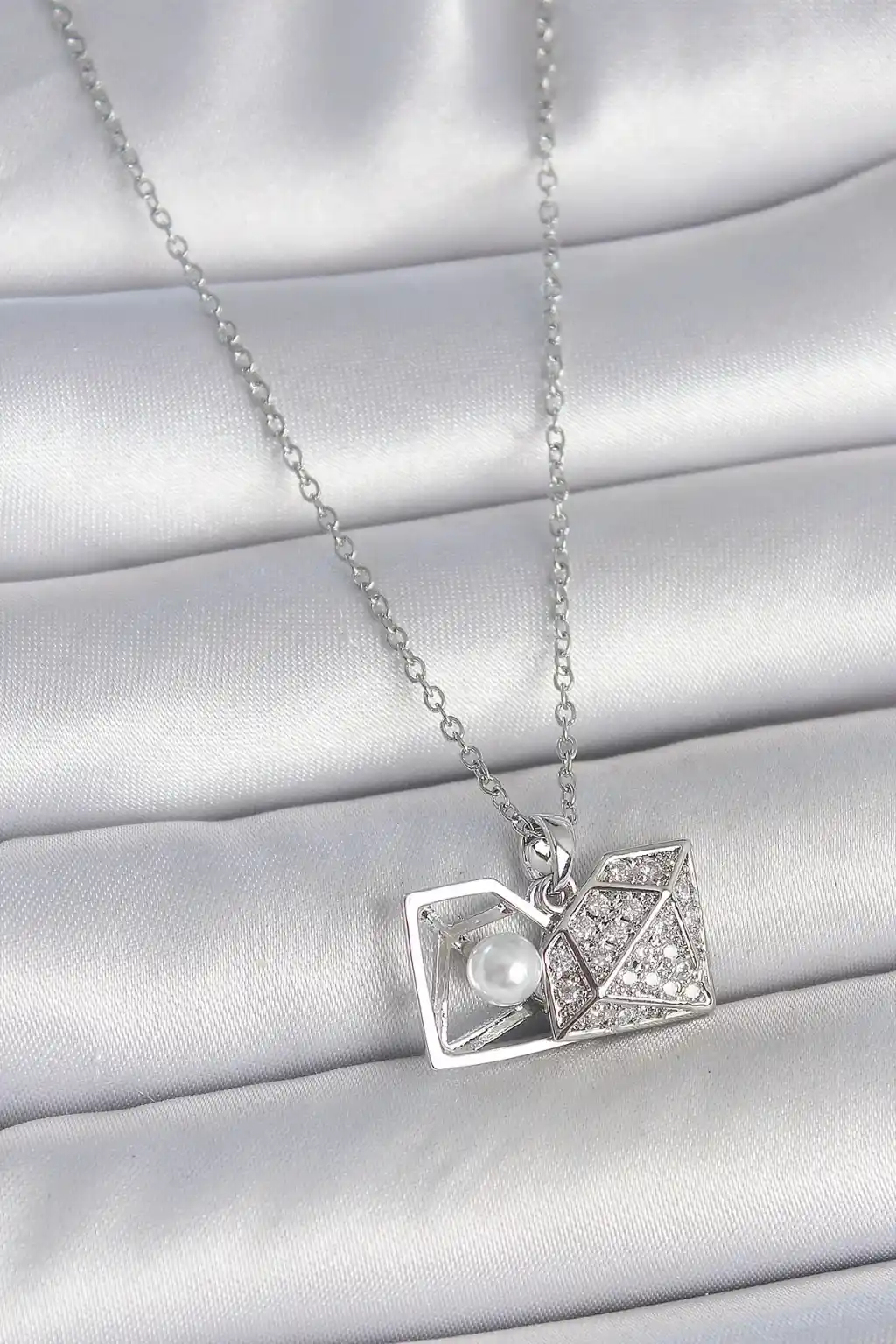 316L Çelik Gümüş Renk Zincir Zirkon Taşlı İncili Açılır Elmas Model Kadın Kolye