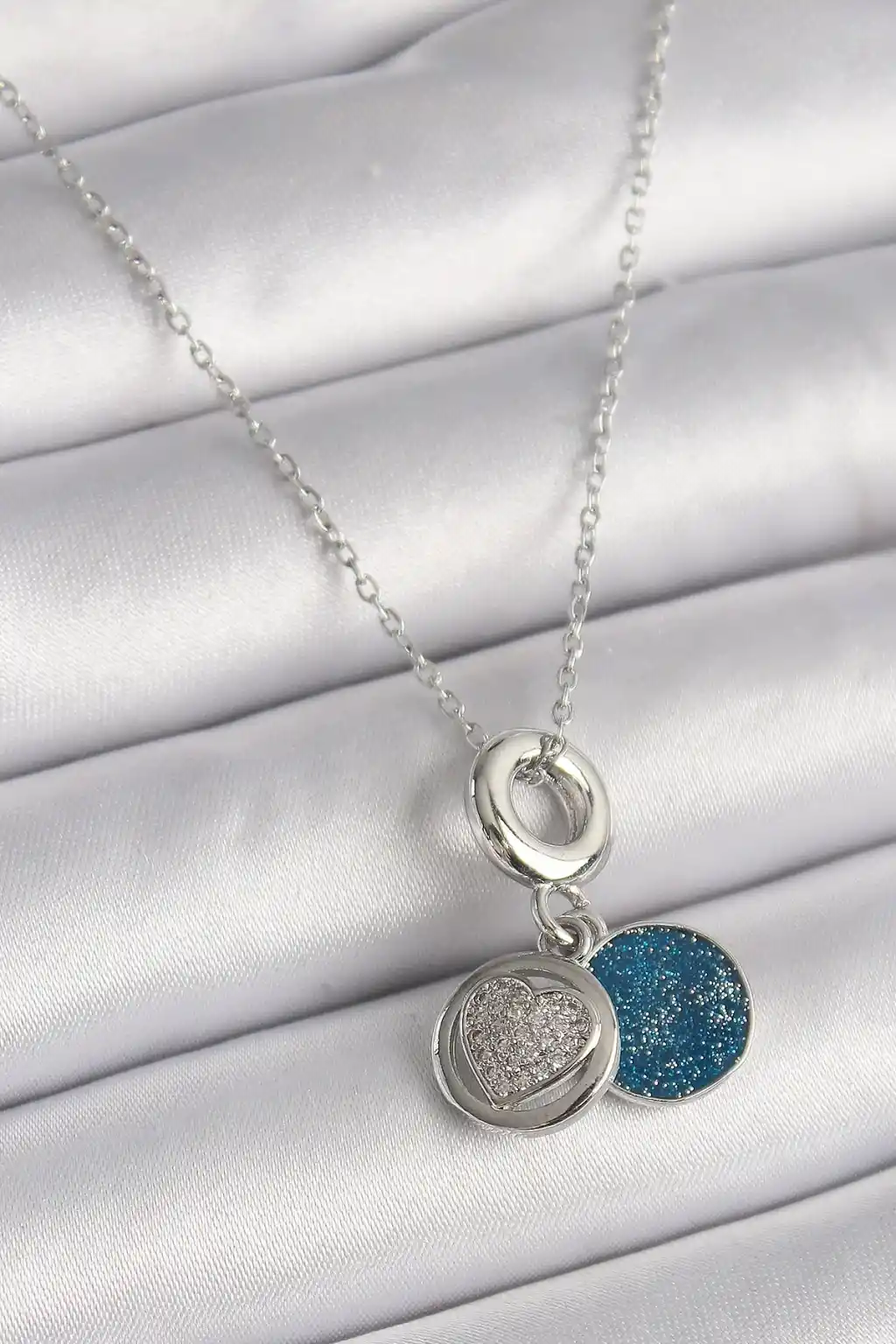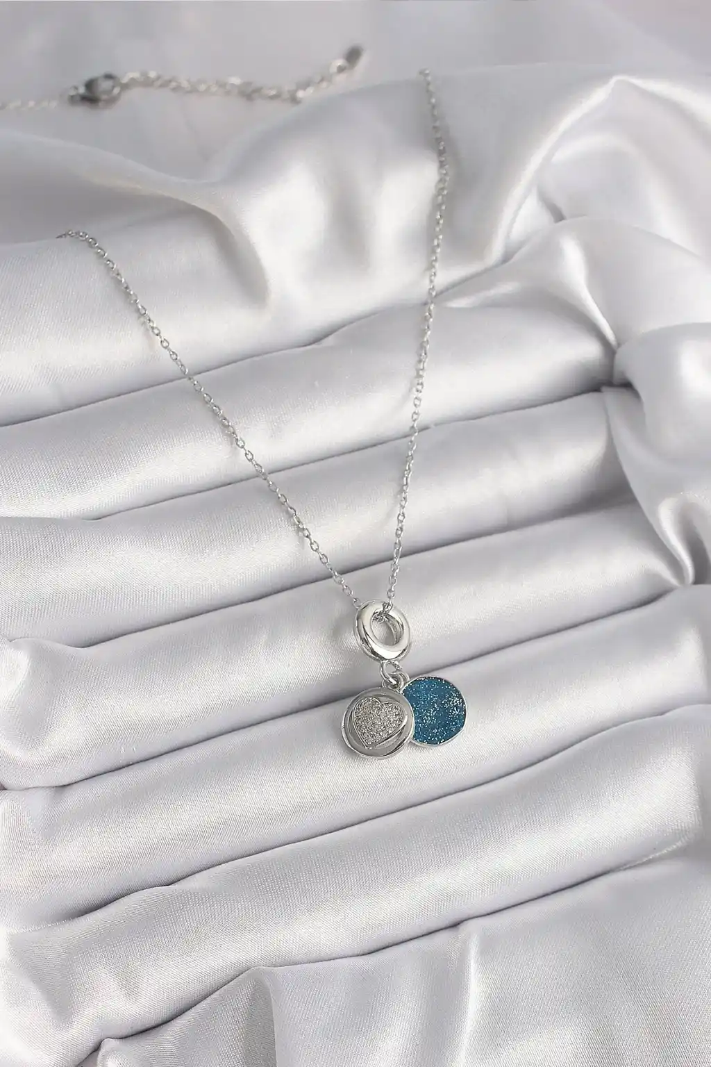 316L Çelik Gümüş Renk Zincir Zirkon Taşlı İşleme Mavi Simli Kadın Kolye