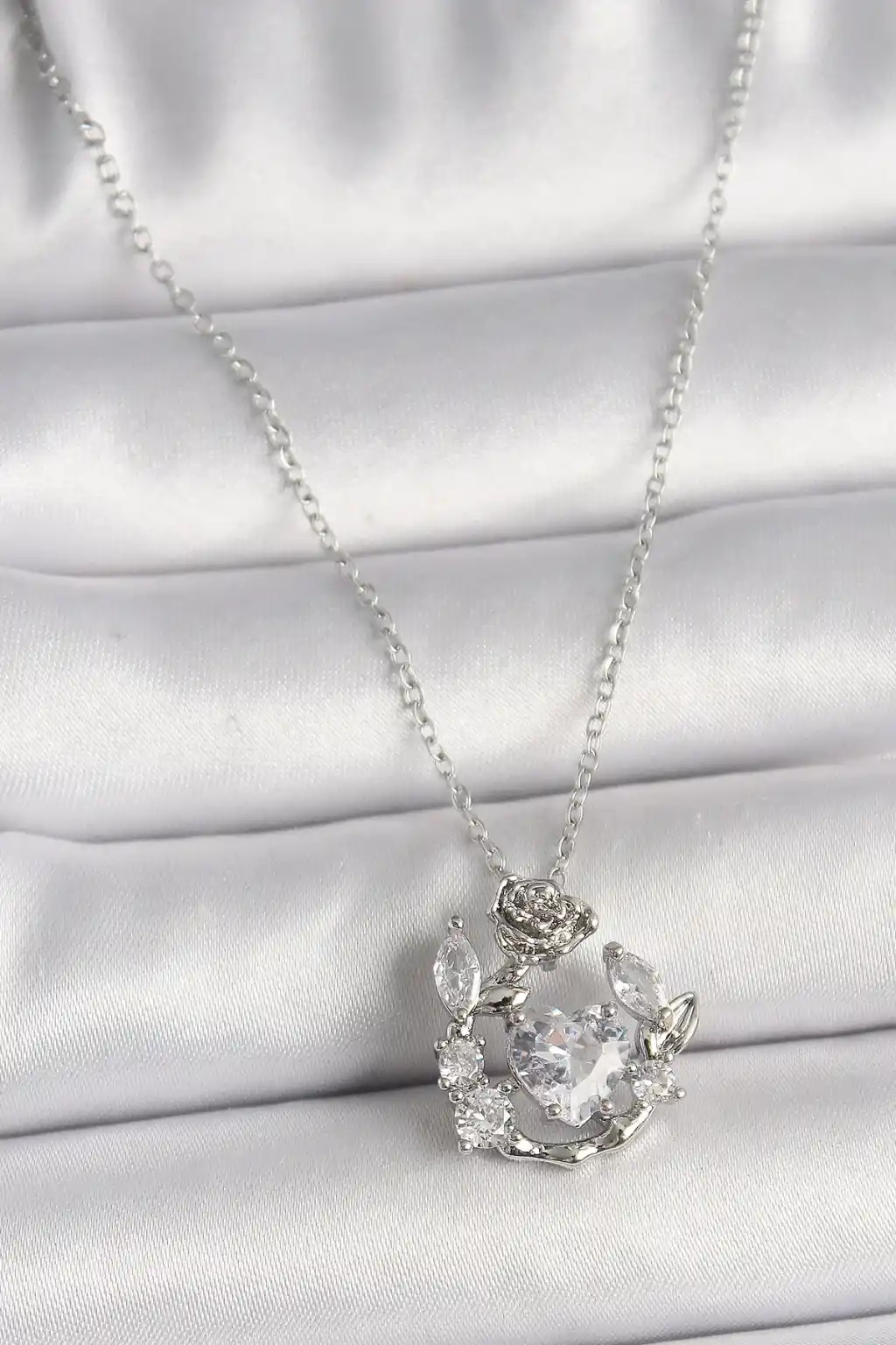 316L Çelik Gümüş Renk Zincir Zirkon Taşlı Kalp Figür Gül Detay Kadın Kolye