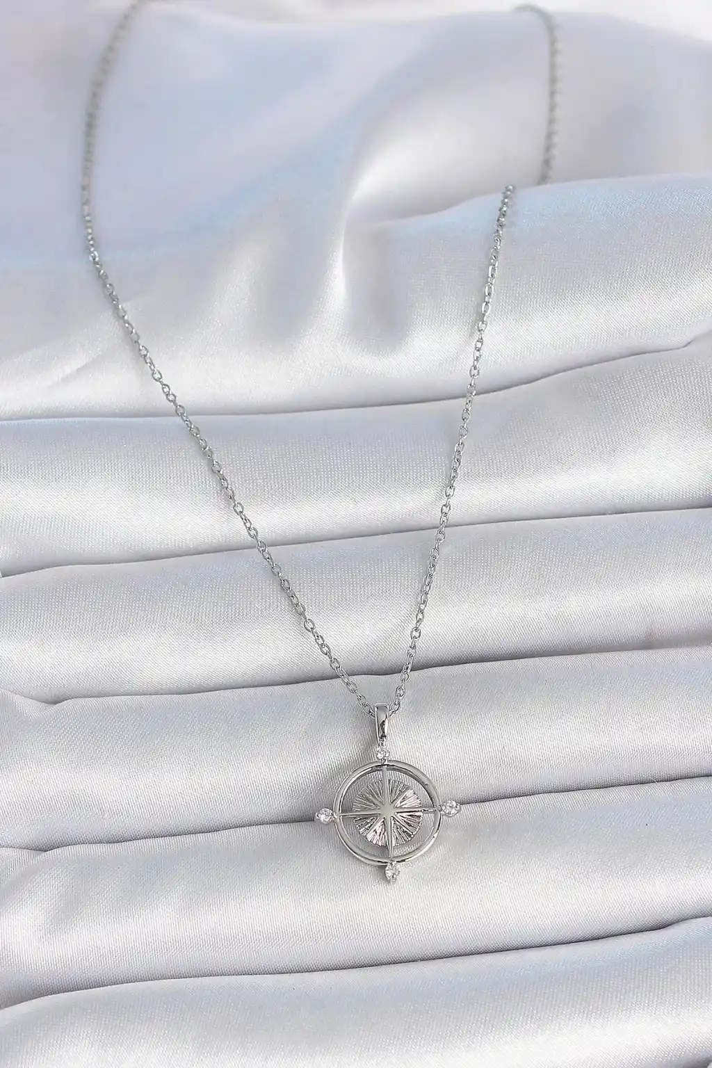 316L Çelik Gümüş Renk Zincir Zirkon Taşlı Pusula Model Kadın Kolye