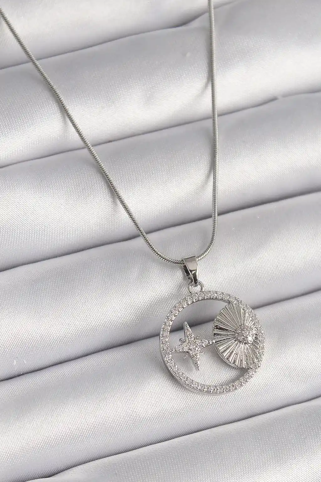 316L Çelik Gümüş Renk Zincir Zirkon Taşlı Yıldız Madalyon Model Kadın Kolye