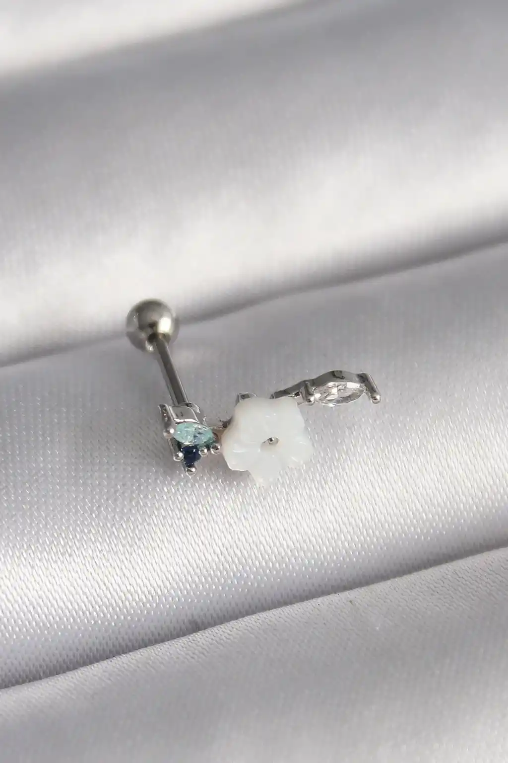 316L Çelik Gümüş Renk Zirkon Taş Detay Beyaz Çiçek Model Tragus Piercing