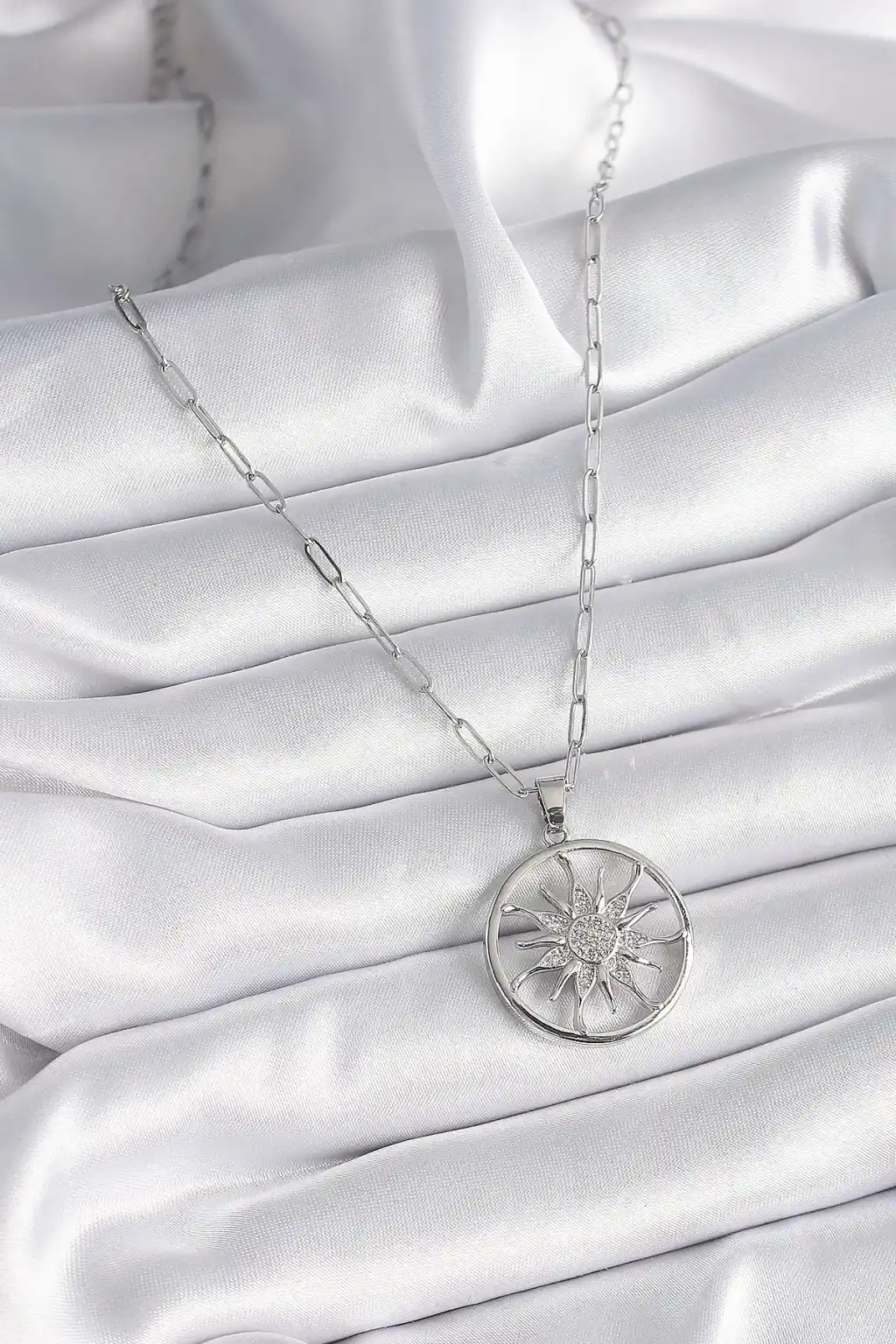 316L Çelik Gümüş Renk Zirkon Taşlı Güneş Madalyon Model Kadın Kolye